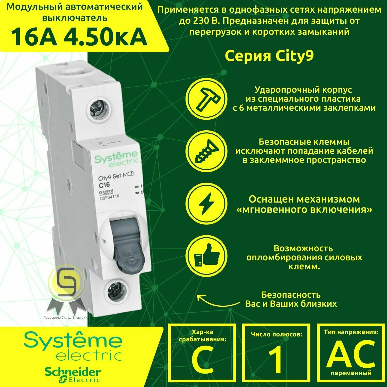 Автоматический выключатель Systeme Electric City9 Set 1P, 16А, С, 4,5кА, 230В