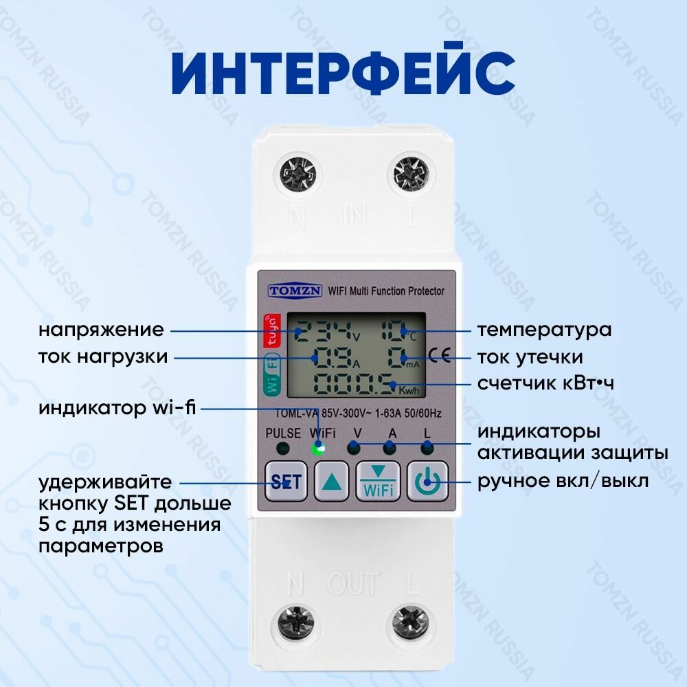 Умный выключатель WiFi TOMZN TOML-VA на DIN рейку с дисплеем / Счётчик электроэнергии, циклический таймер, ограничение по току и напряжению, измеритель температуры и тока утечки / Управление Tuya информация: