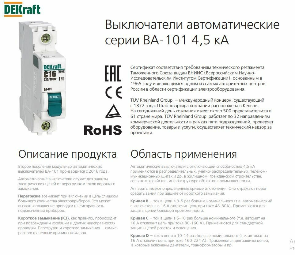 Systeme electric Автоматический выключатель DEKraft 1Р 16А х-ка C ВА-101 4,5кА информация: