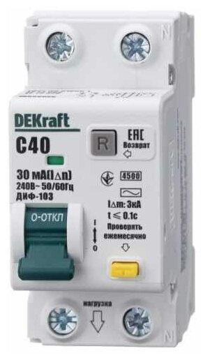 Выключатель автоматический дифференциального тока АВДТ 1Р+N 40А 30мА тип AC х-ка C ДИФ-103 4.5кА | код 16056DEK | DEKraft ( 1шт. ) информация: