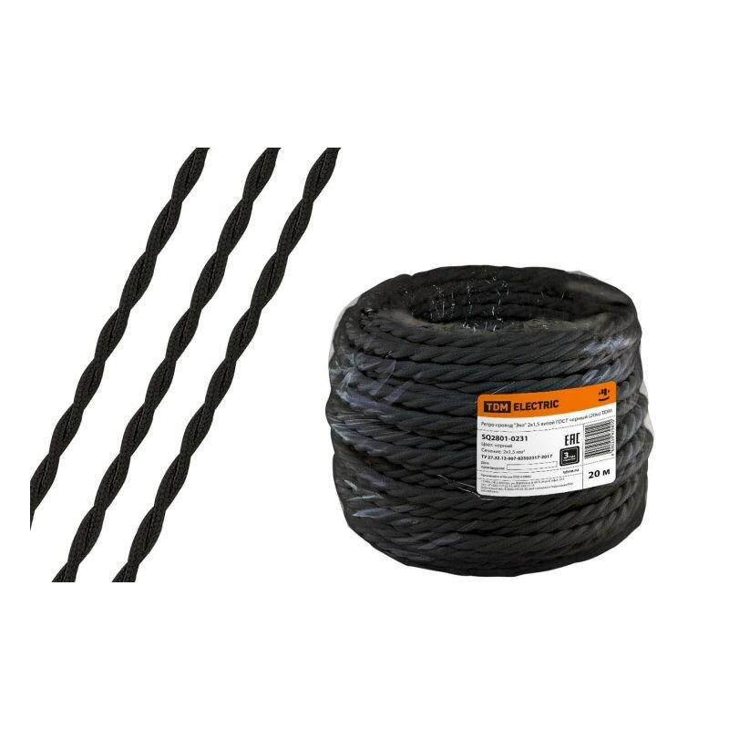Отзывы на Ретро провод "Эко" 3х2,5 мм2, 20 м, черный ГОСТ витой винтажный плетеный текстильный TDM