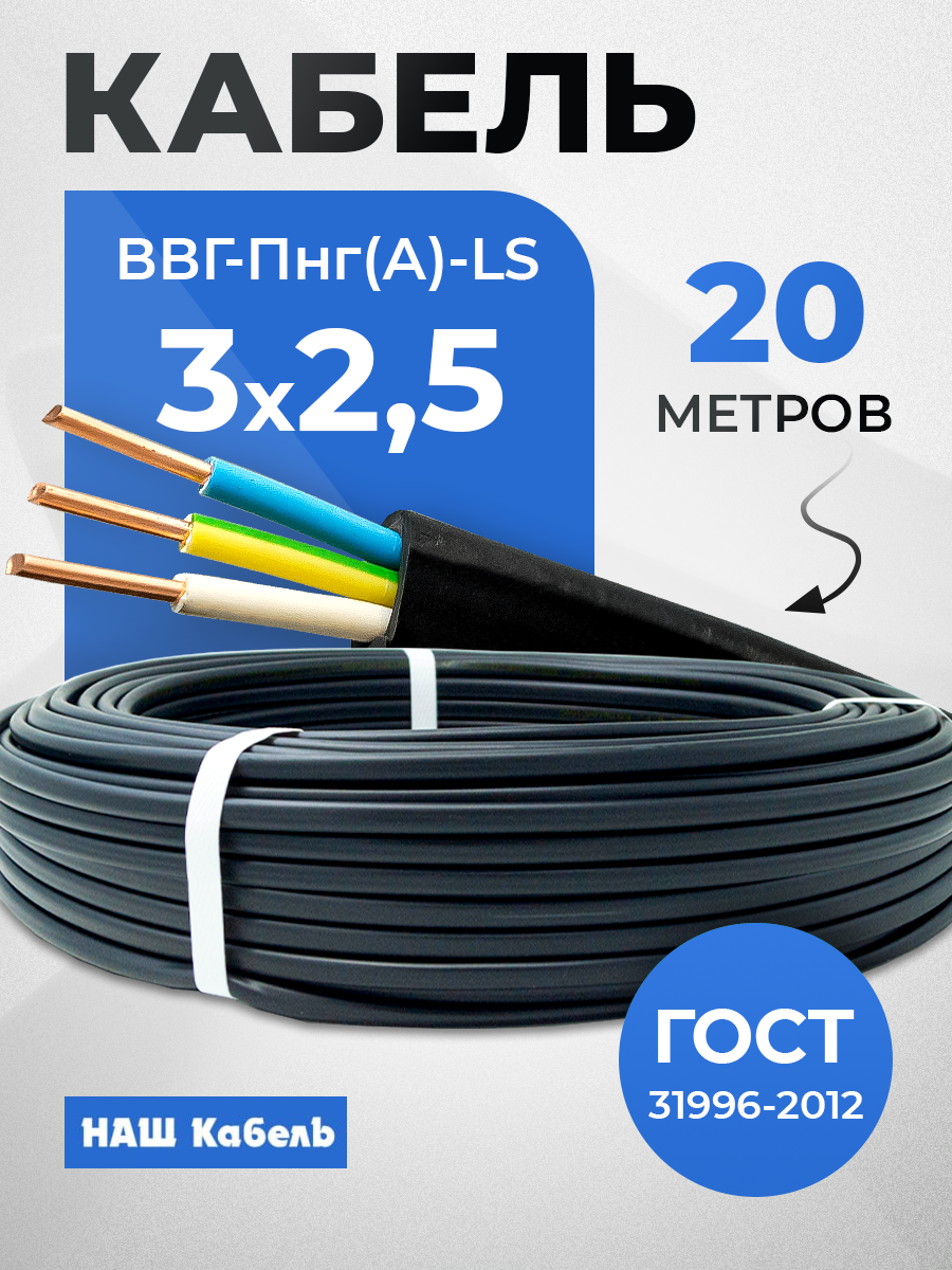 10 цен на Кабель электрический трехжильный силовой медный ВВГ-Пнг(А)-LS ГОСТ 3*2,5мм2 бухта 20 метров "Наш кабель"