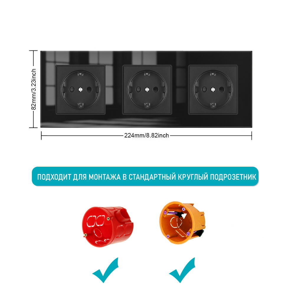 Отзывы на Розетка тройная 16А 250В, со шторками, рамка закаленное стекло, Чёрный