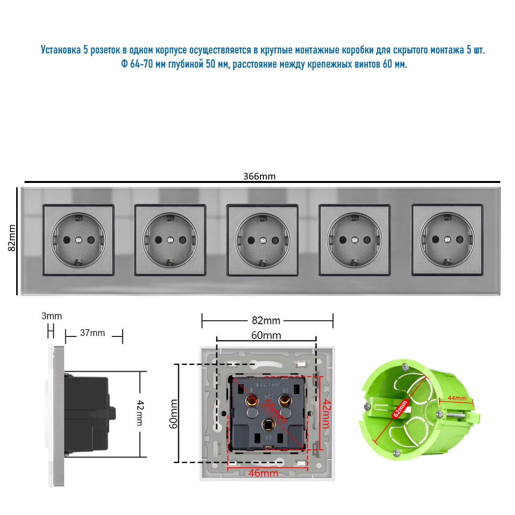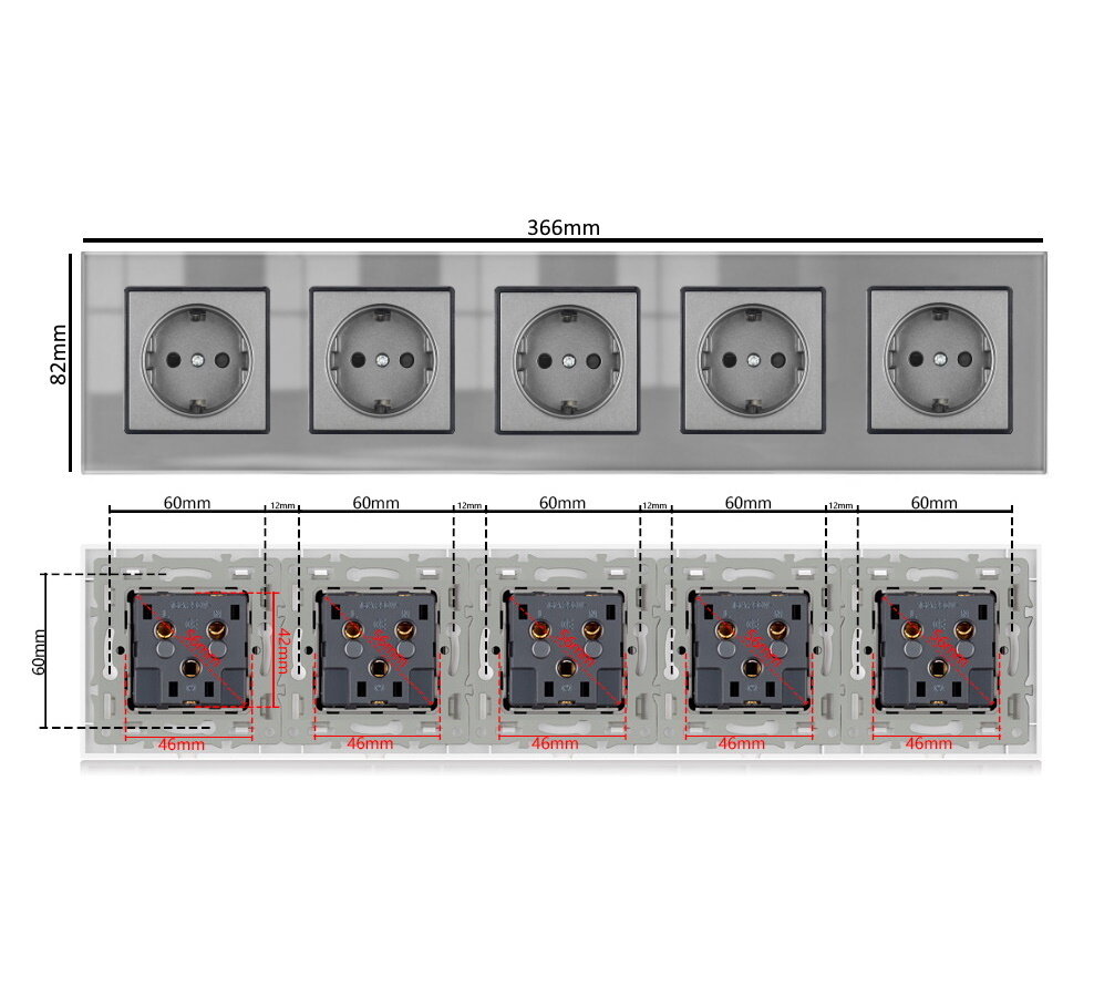 Отзывы на Розетка пятипостовая 5 постов 16А 250В, со шторками, рамка закаленное стекло, Серый