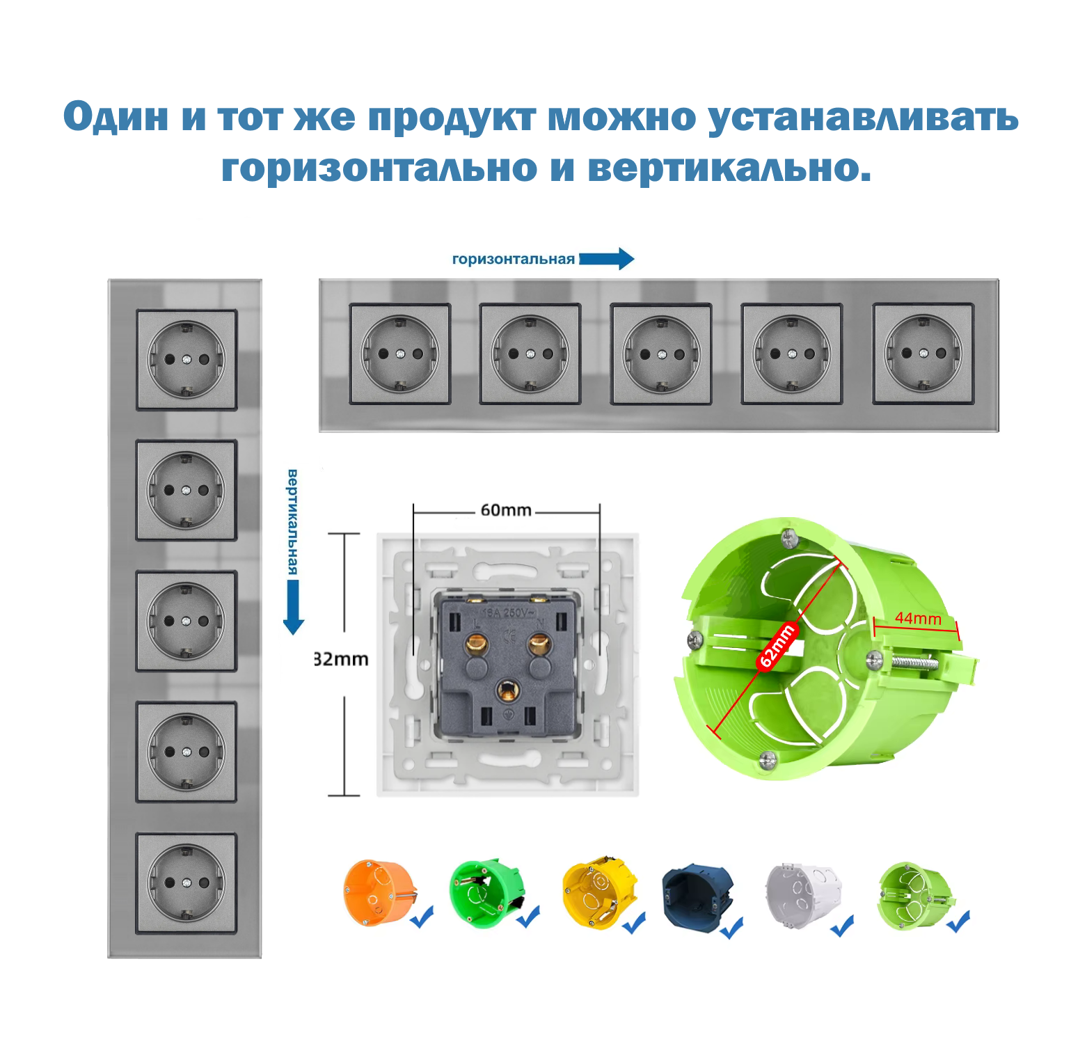 10 цен на Розетка пятипостовая 5 постов 16А 250В, со шторками, рамка закаленное стекло, Серый