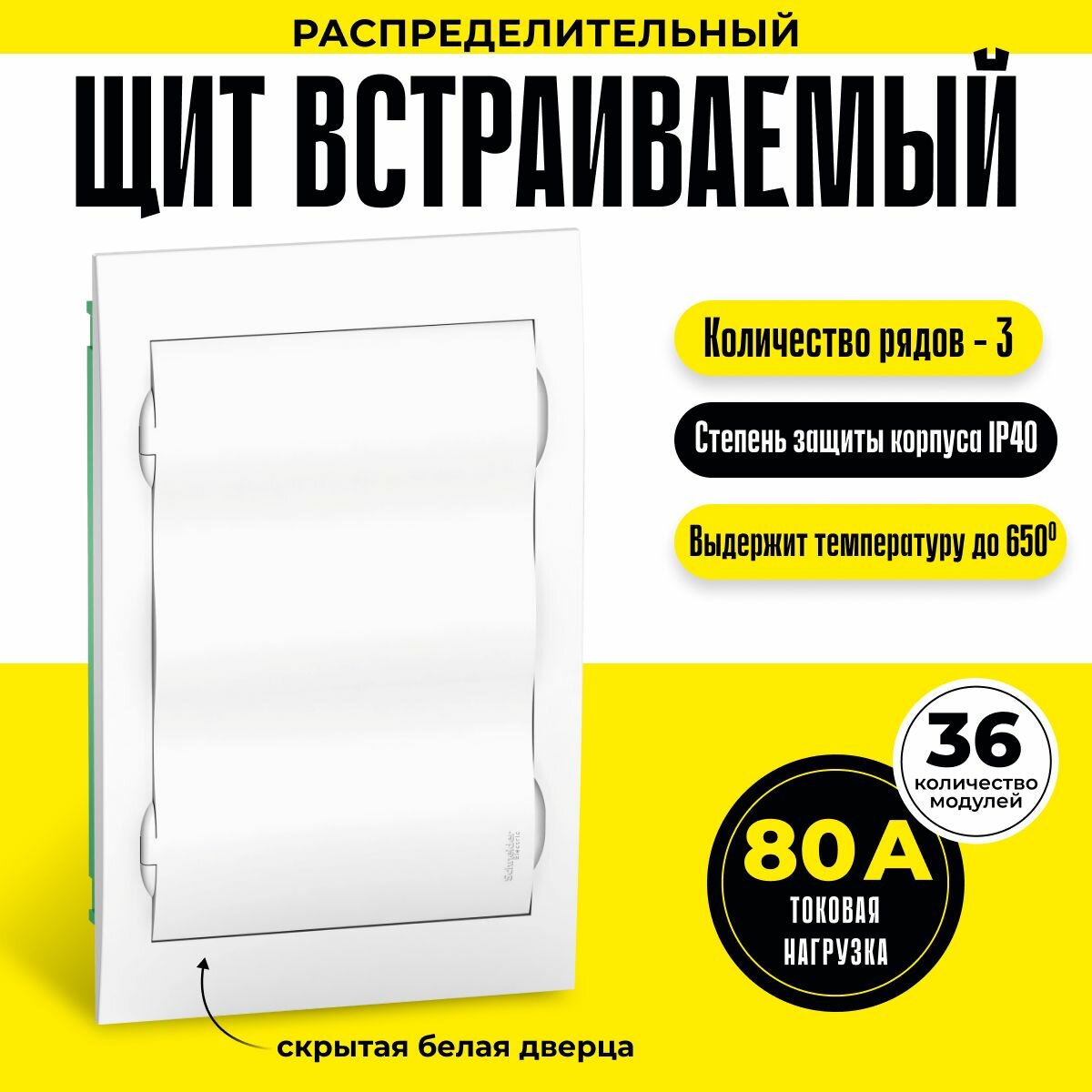 Щит встраиваемый на 36 модулей с клемниками N+PE Schneider Electric/Systeme Electric Easy9 Box 80А 3 ряда с белой дверцей скрытой установки EZ9E312P2FRU белый шнайдер информация:
