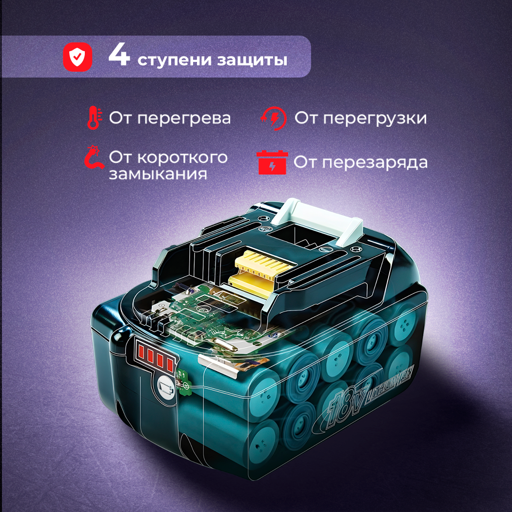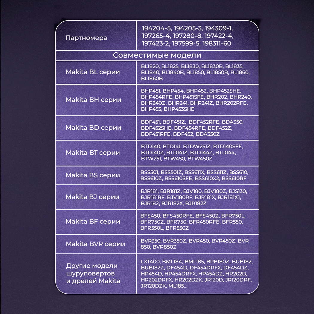| Совместимость | Мakita BL1820; BL1825; BL1830; BL1830B; BL1835; BL1840; BL1840B; BL1850; BL1850B; BL1860; BL1860B; BDF451, BDF451Z, BDF452RFE, BDA350, BDF452SHE, BDF454RFE, BDF452Z, BDF451RFE, BDF452, BDA350Z; BTD140, BTD141, BTDW251Z, BTD140SFE, BTD140Z, BTD141Z, BTD144Z, BTD144, BTW251, BTW450, BTW450Z, 194204-5, 194205-3, 194309-1, 197265-4, 197280-8, 197422-4, 197423-2, 197599-5, 198311-60. |