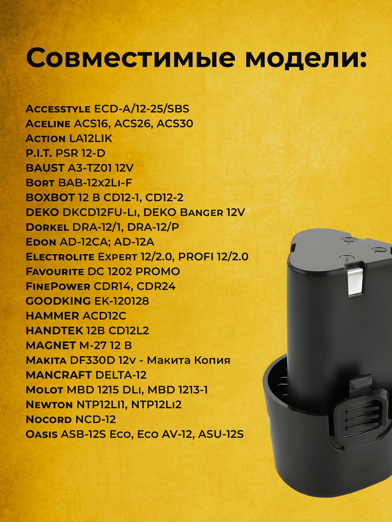 | Совместимый бренд | Aceline / BAUST / Bort / Dorkel / Edon / Electrolite / GOODKING / Hammer / Handtek / MAGNET / Molot / Newton / Nocord / Oasis / P.I.T. / PROFIPOWER / STARTIS / SuperGen / VVOSAI (WOSAI) / Vinzor / zitrek / Витязь / СОЮЗ |
