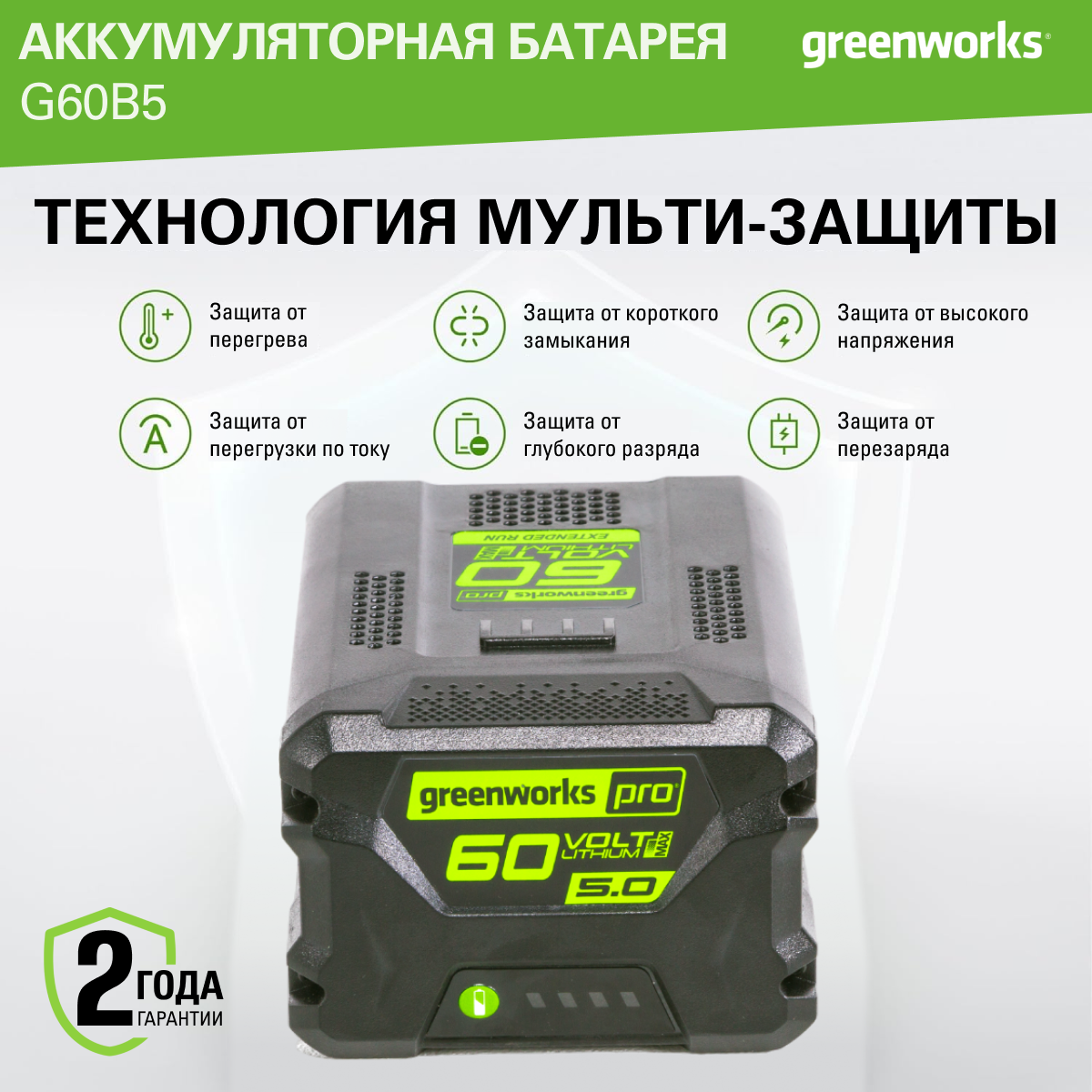 Аккумулятор GREENWORKS G60B5 60В,5Ач (2944907) информация: