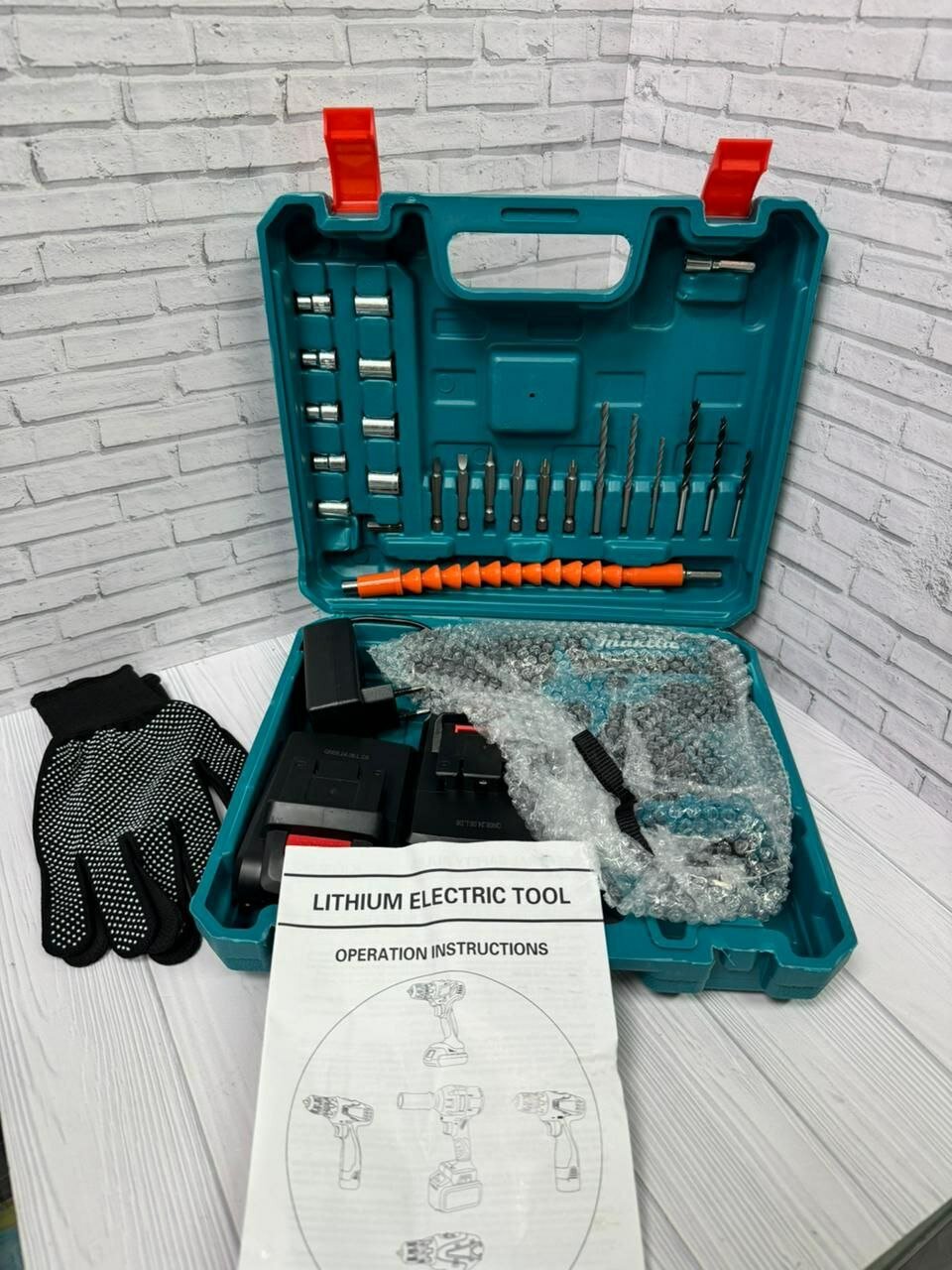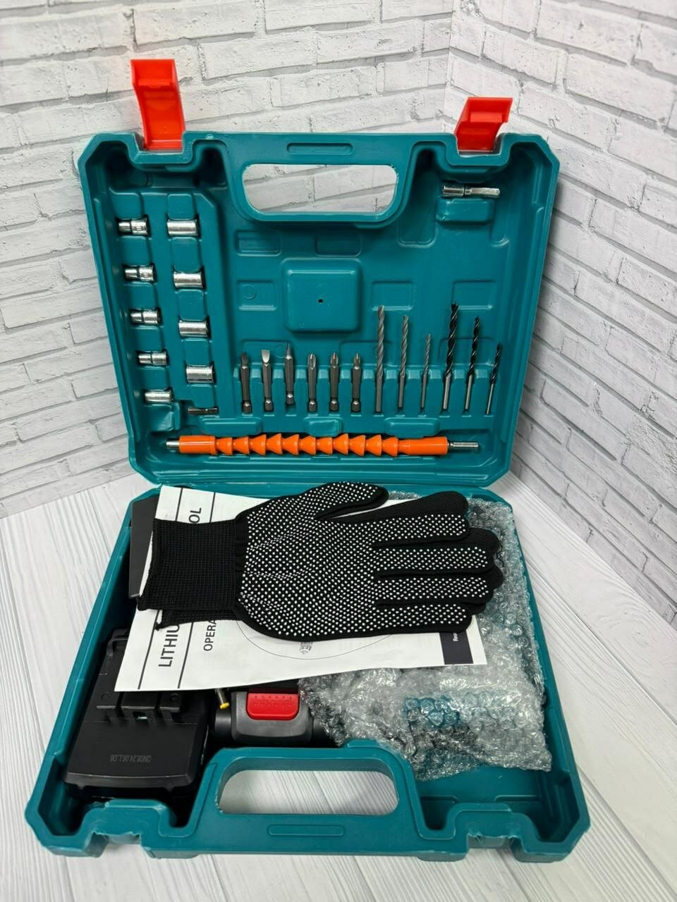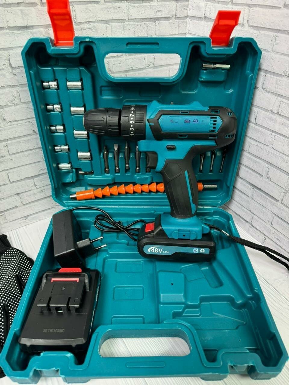 Шуруповерт аккумуляторный, строительный, дрель-шуруповерт с двумя аккумуляторами 48 V и набором инструментов в кейсе информация: