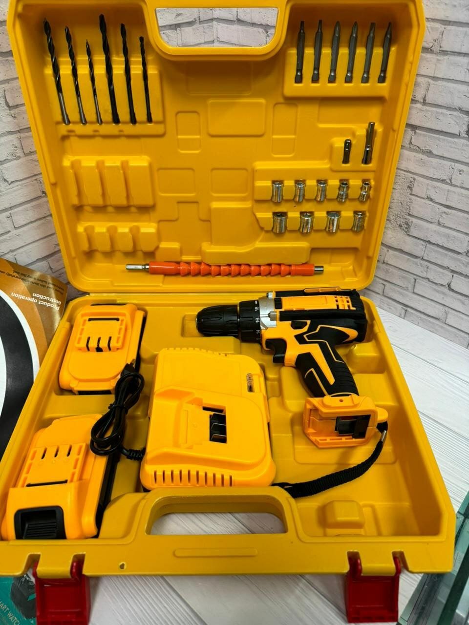 Отзывы на Шуруповерт аккумуляторный, строительный, дрель-шуруповерт с двумя аккумуляторами и набором инструментов в кейсе, желтый