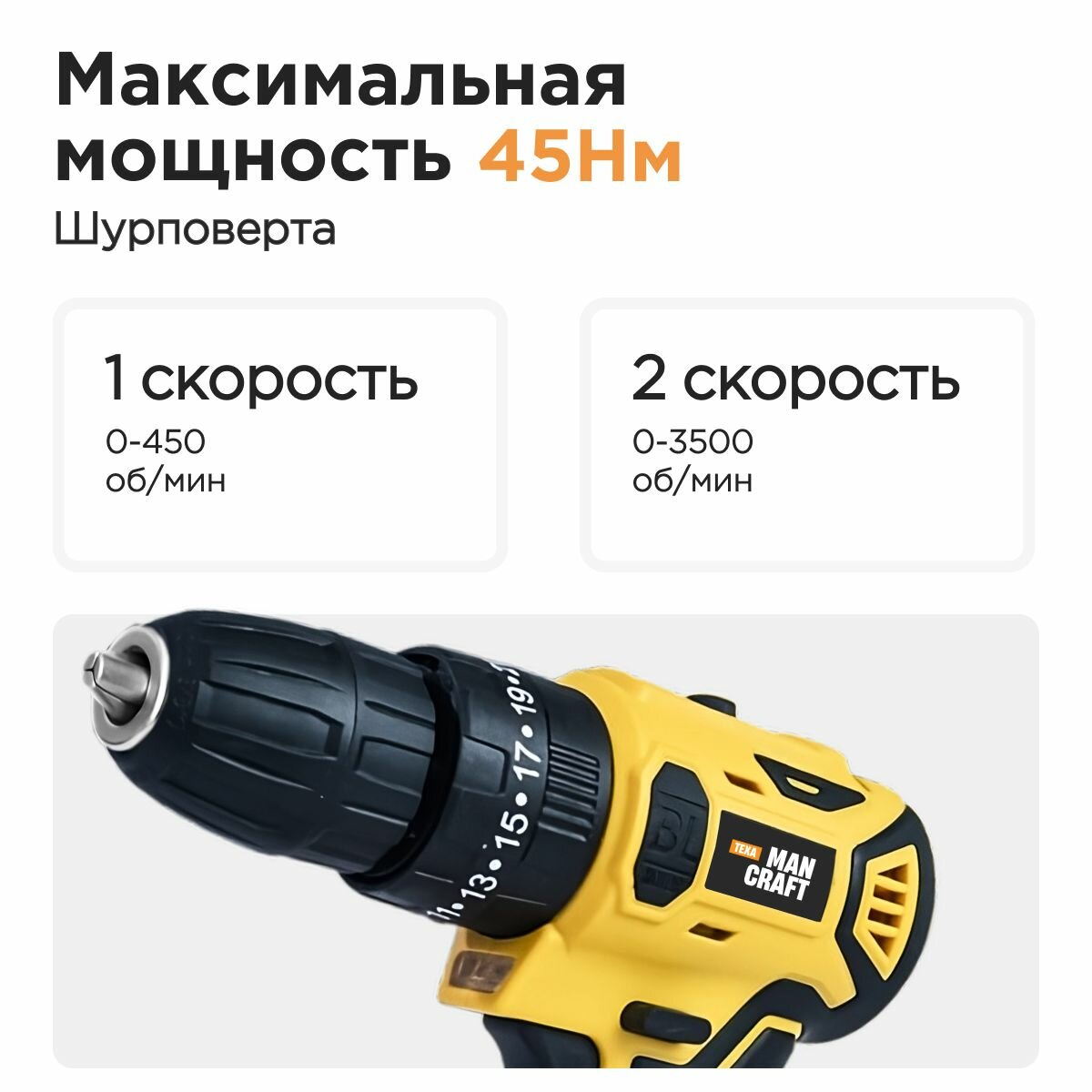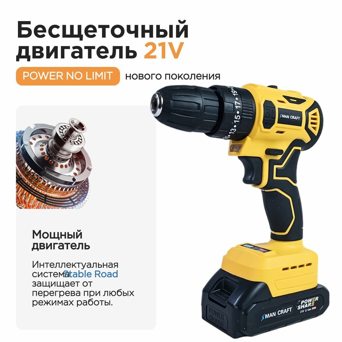 Дрель-шуруповерт аккумуляторная бесщеточная MANCRAFT аккумуляторные инструменты, 21 В, 2 Ач, 45 Нм, 2 АКБ информация: