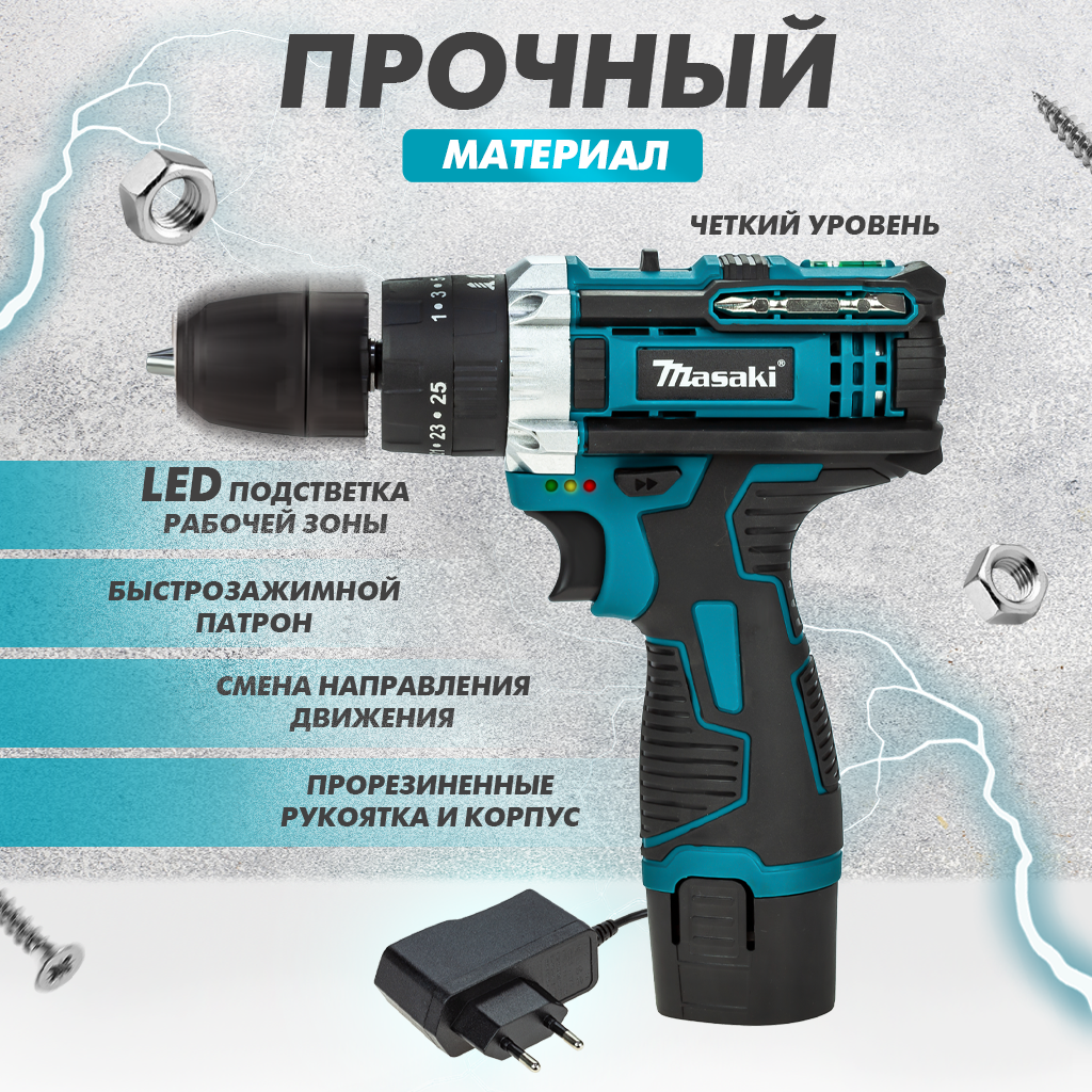 Отзывы на Аккумуляторная дрель-шуруповерт MASAKI с 2 скоростями, 24 насадки, 12 В, 2 АКБ в кейсе