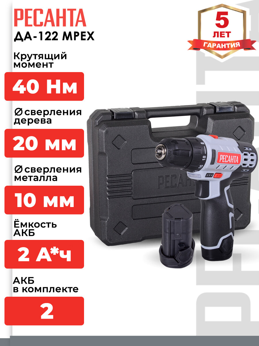 10 цен на Шуруповерт - дрель аккумуляторная Ресанта ДА-122 MPEX (быстрозажимной, 1400 об/мин, 40/20 Нм, 12 В, 2 А*ч, 0.96 кг, кейс)