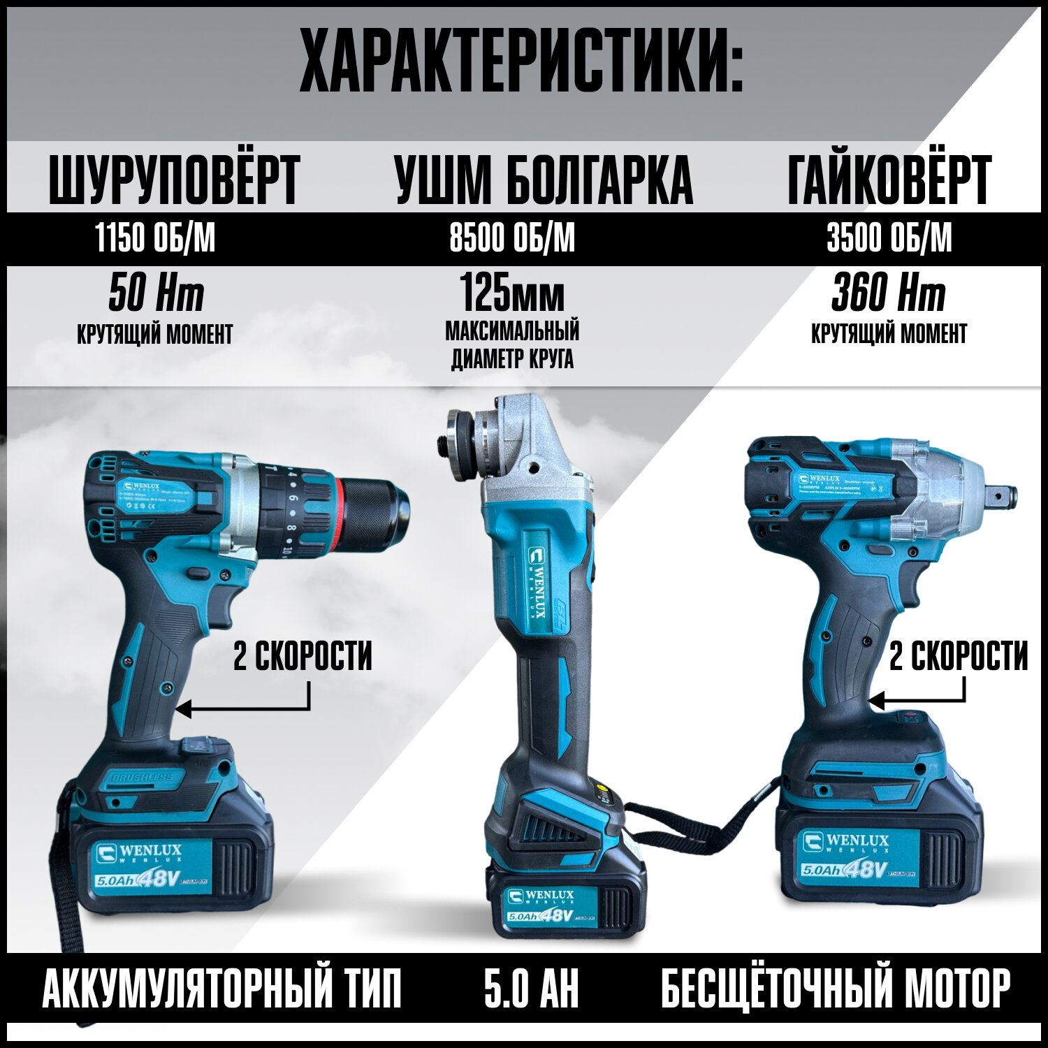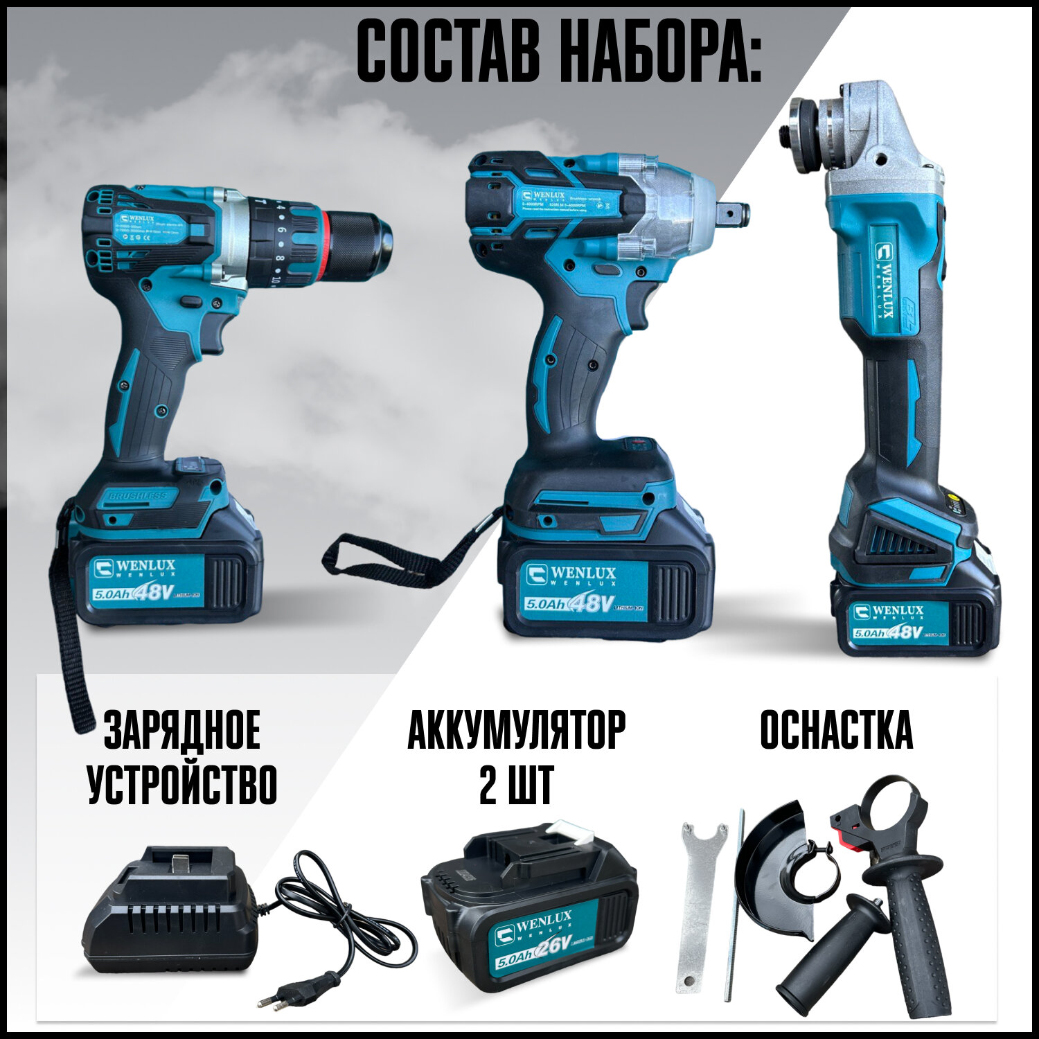 Набор электроинструментов 3в1 WENLUX (болгарка, гайковерт, шуруповёрт) + кейс оснастки в комплекте 68V информация: