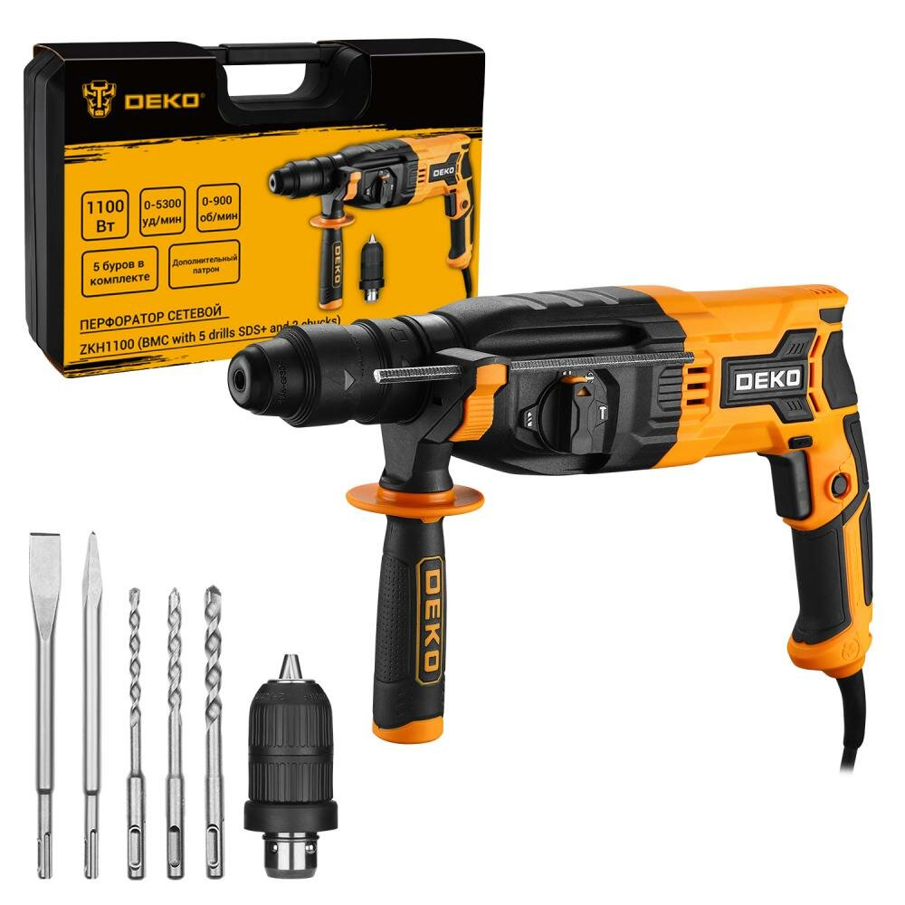 Перфоратор DEKO DKH1100W, 1100 Вт, 5300 уд/мин, 3.5 Дж, 5 буров SDS+ и дополнительный патрон