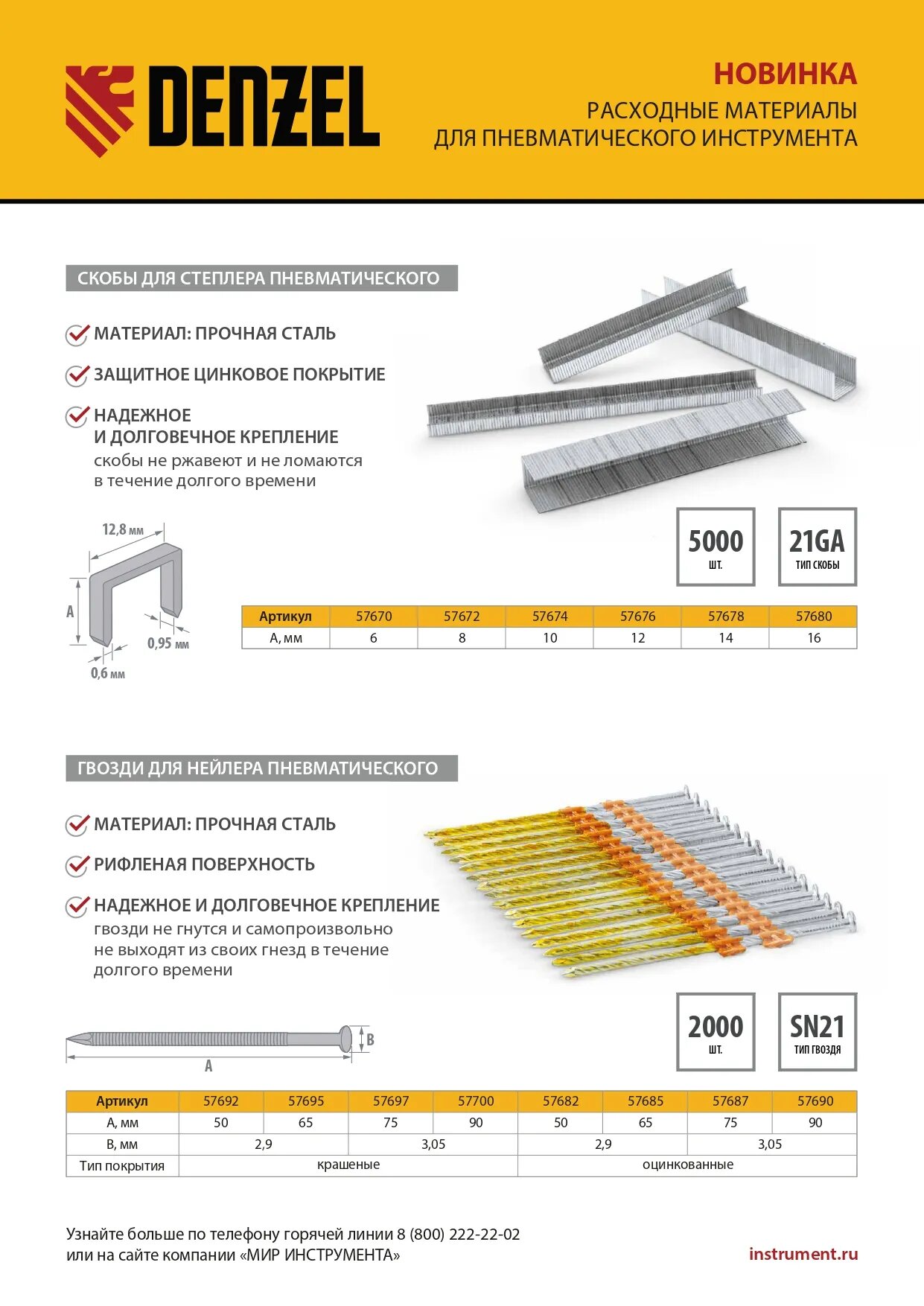 Скобы 21GA для пнев. степл. Denzel 14мм, шир. - 0, 95мм, тол. - 0, 6мм, шир. скобы - 12, 8мм, 5000шт 57678 информация: