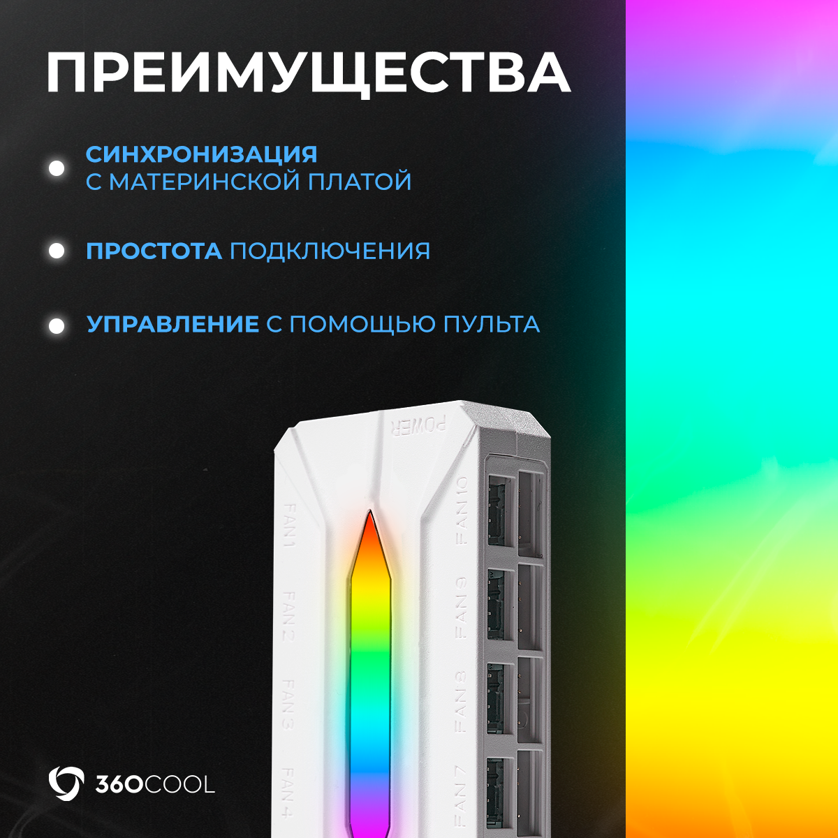 Контроллер к ПК с подсветкой ARGB для вентиляторов 4-Pin/светодиодных лент 3-Pin, синхронизация с мат платой, подключение до 10-ти кулеров, белый информация: