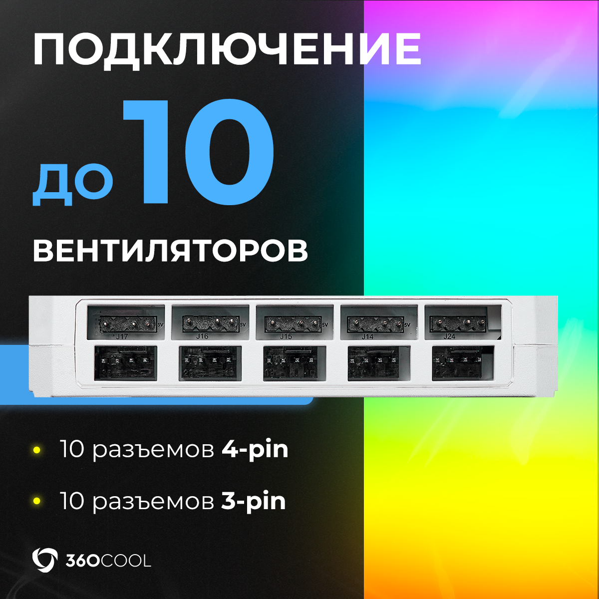 10 цен на Контроллер к ПК с подсветкой ARGB для вентиляторов 4-Pin/светодиодных лент 3-Pin, синхронизация с мат платой, подключение до 10-ти кулеров, белый