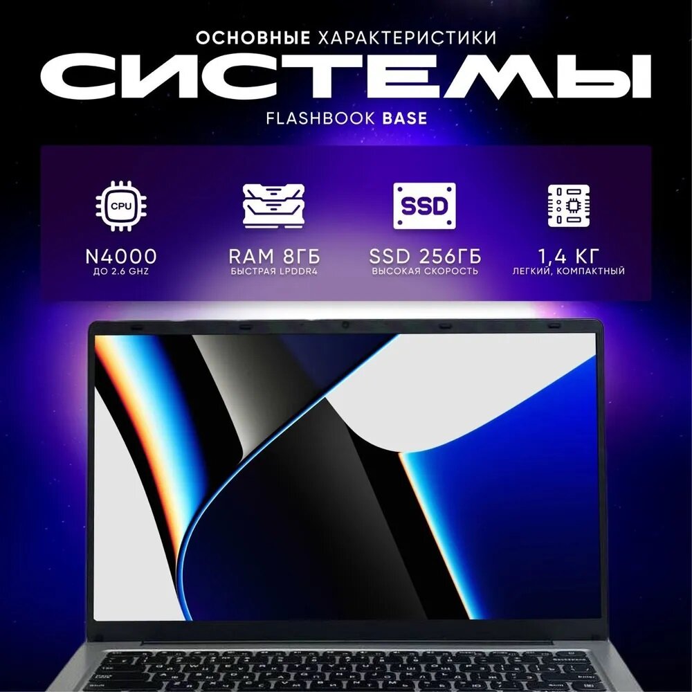 FlashBook Ноутбук 14.1", Intel Celeron N4000, RAM 8 ГБ, SSD 256 ГБ, Intel UHD Graphics 600, Windows Pro, серебристый, Русская раскладка информация: