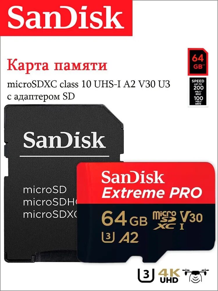 Карта памяти SanDisk Extreme PRO microSDXC 64 ГБ Class 10 UHS-I U3, V30, A2 (R/W 200/90 Mb/s) + SD адаптер