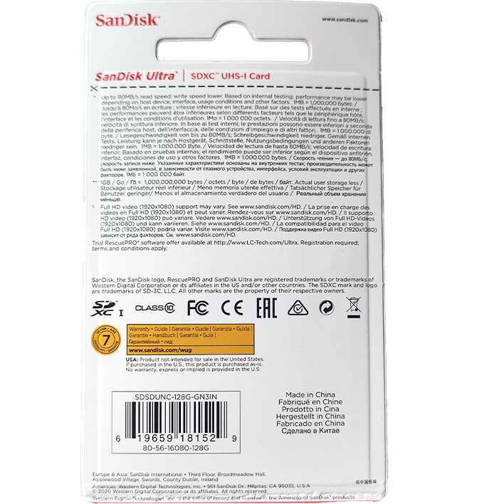 Карта памяти SanDisk Ultra SDXC 128ГБ 80MB/s Class 10 UHS-I (SDSDUNC-128G-GN3IN) информация: