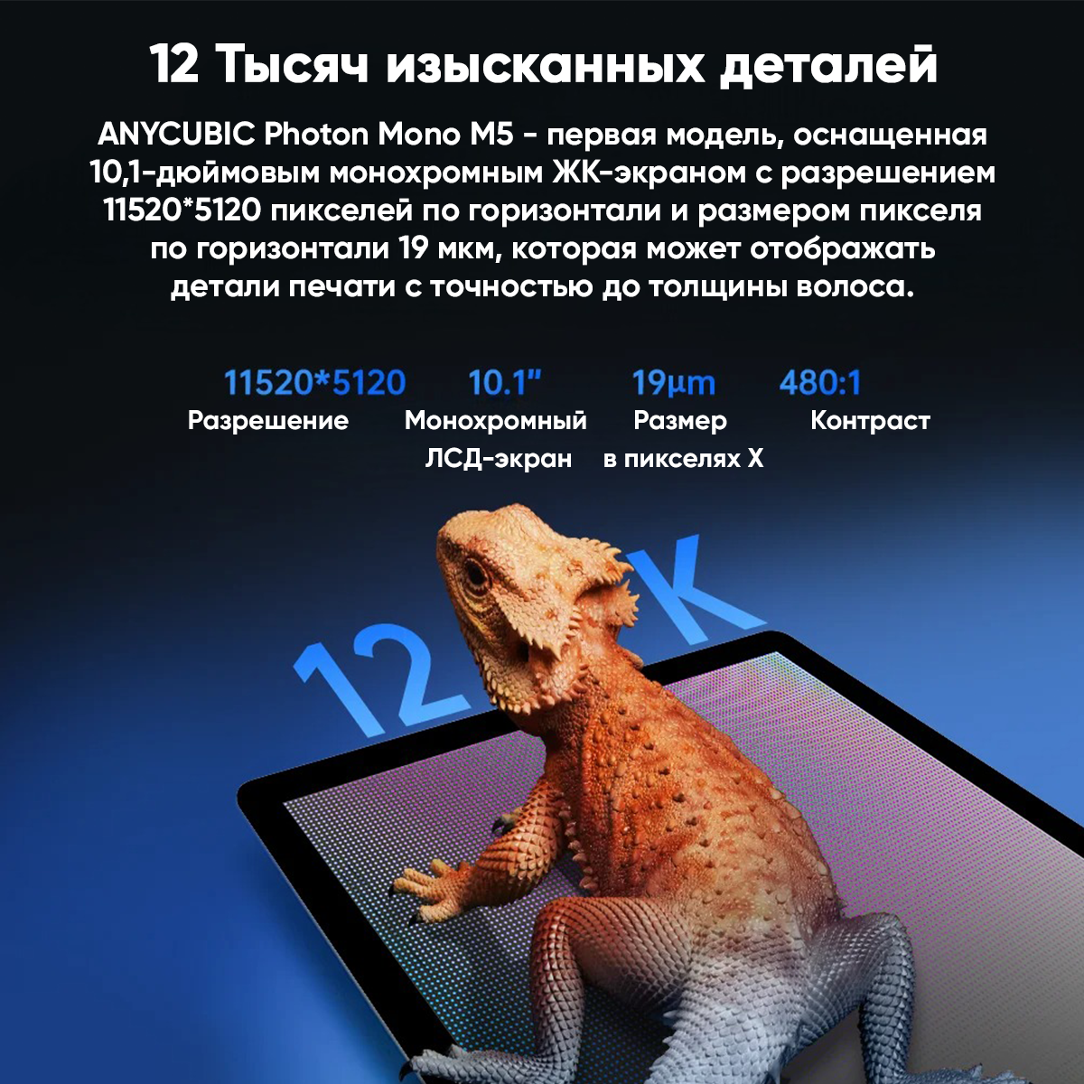 3д принтер ANYCUBIC Photon Mono M5, 200х218х123, SLS, ЖК-дисплей, 300 мм/сек скорость печати информация: