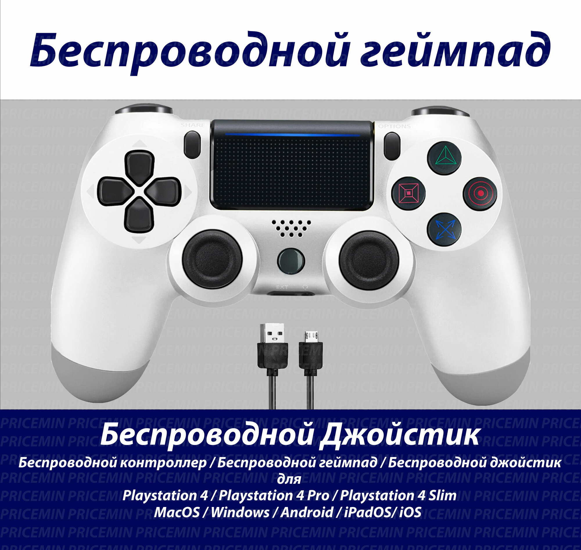 Джойстик для Playstation 4, Геймпад подходит для PS4, PC, MacBook, Android, IOS, беспроводной джойстик bluetooth для ПК, Белый, Pricemin