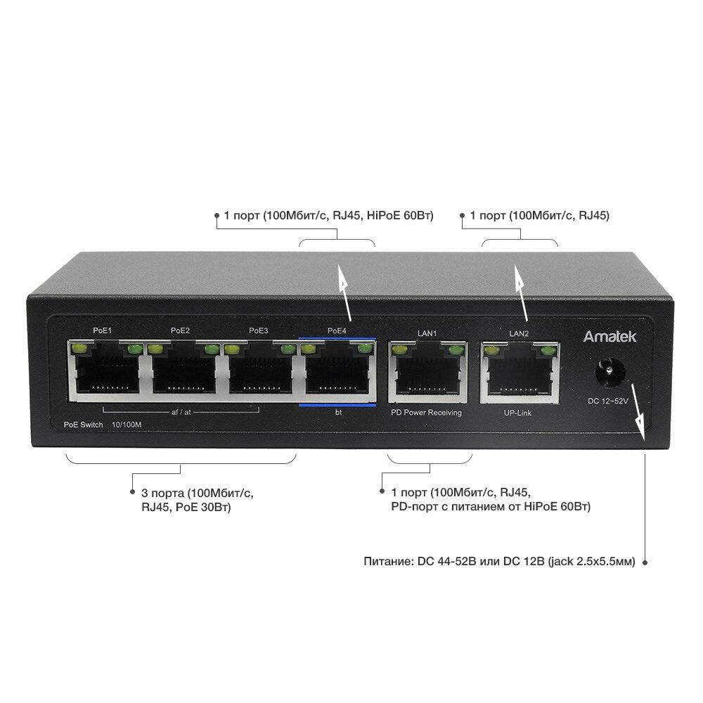 Отзывы на Amatek AN-PE42 6-портовый 100Мбит/с коммутатор с питанием от HiPoE