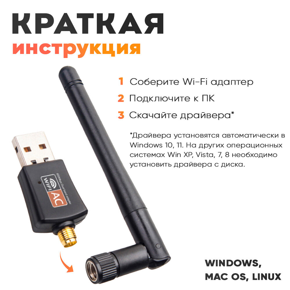 WiFi USB Адаптер 2,4 Ггц, 5 Ггц до 600 Мбит/с (433 + 150 Мбит/с) RTL8811 для компьютеров, 802.11b/g/n со встроенной антенной / Вайфай адаптер для ПК, Беспроводной приемник для компьютера информация: