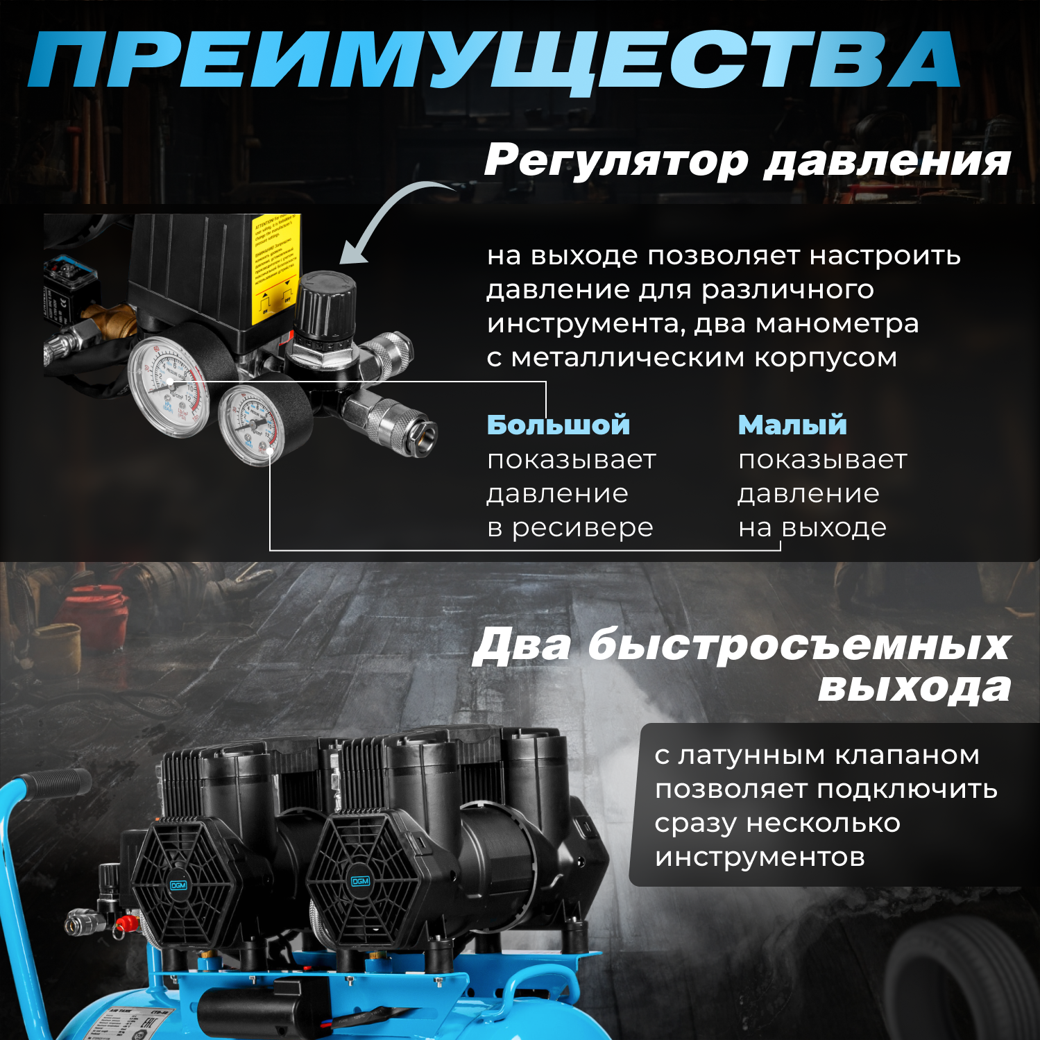 Отзывы на Компрессор воздушный безмасляный DGM AC-450F (520 л/мин, 8 атм, коаксиальный, ресив. 50 л, 230 В, 3 кВт) (DG2720-5)