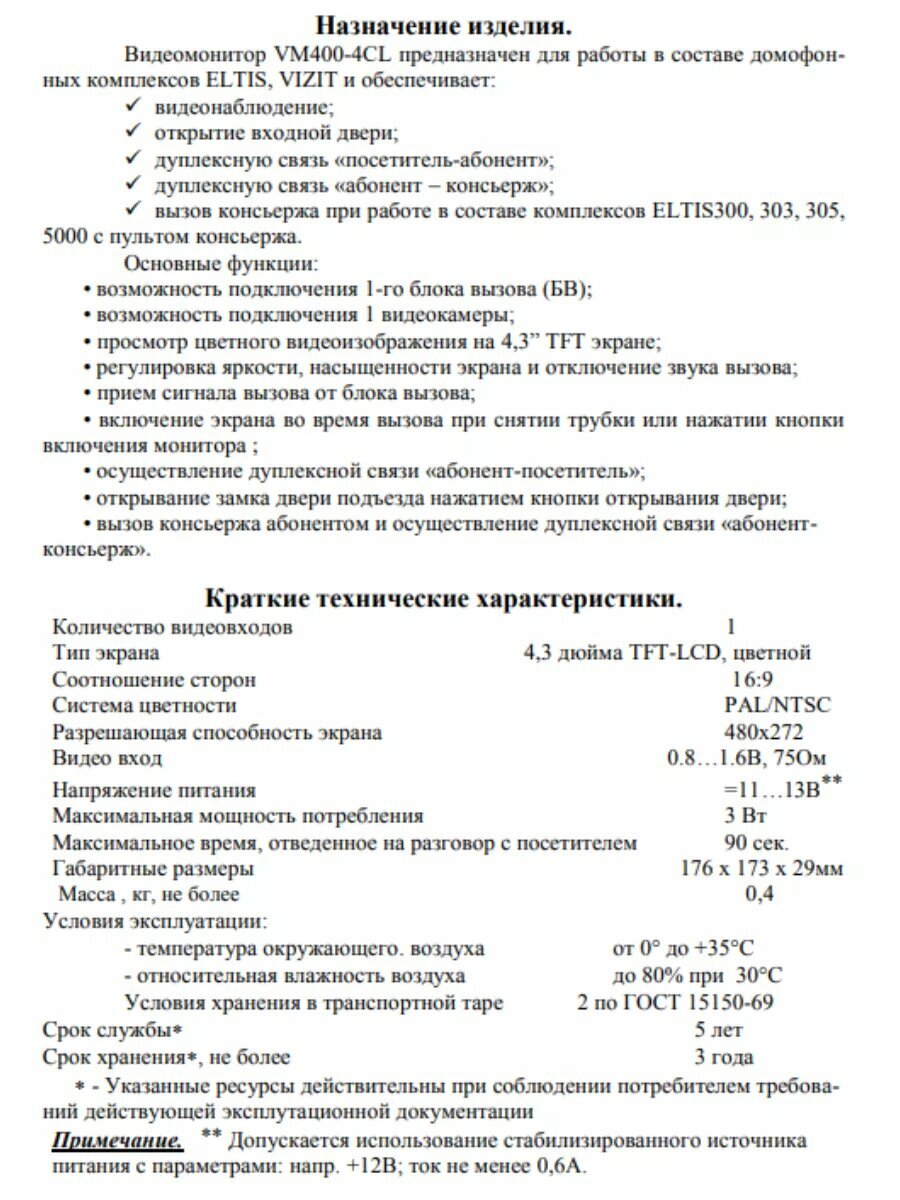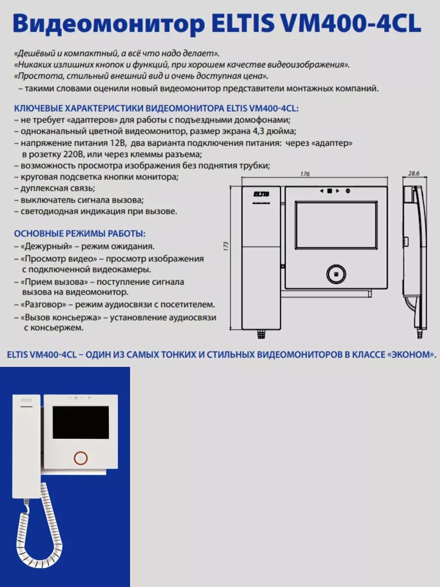 Видеодомофон Eltis VM400-4CL монитор цветной 1шт информация: