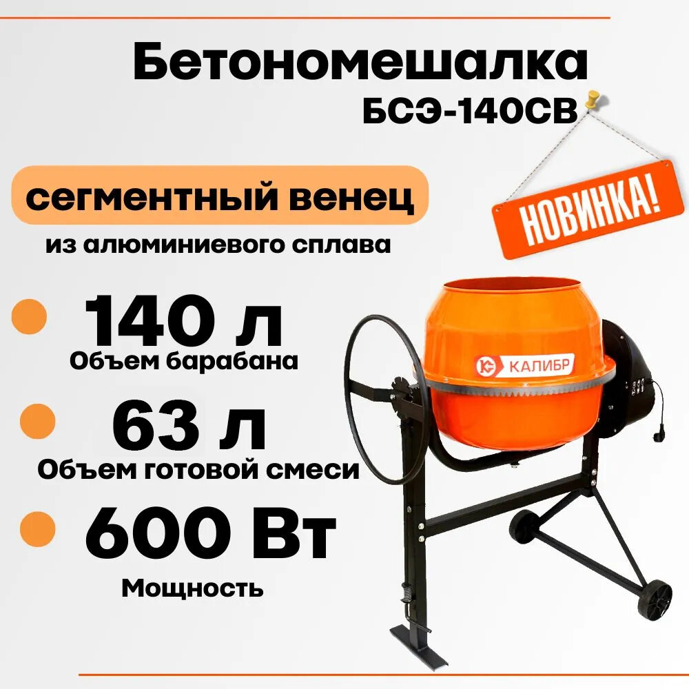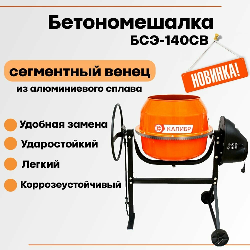 Бетоносмеситель Калибр БСЭ-140СВ сегментный венец из алюминиевого сплава, объем 140 литров, мощность 600 Вт, бетономешалка строительная информация:
