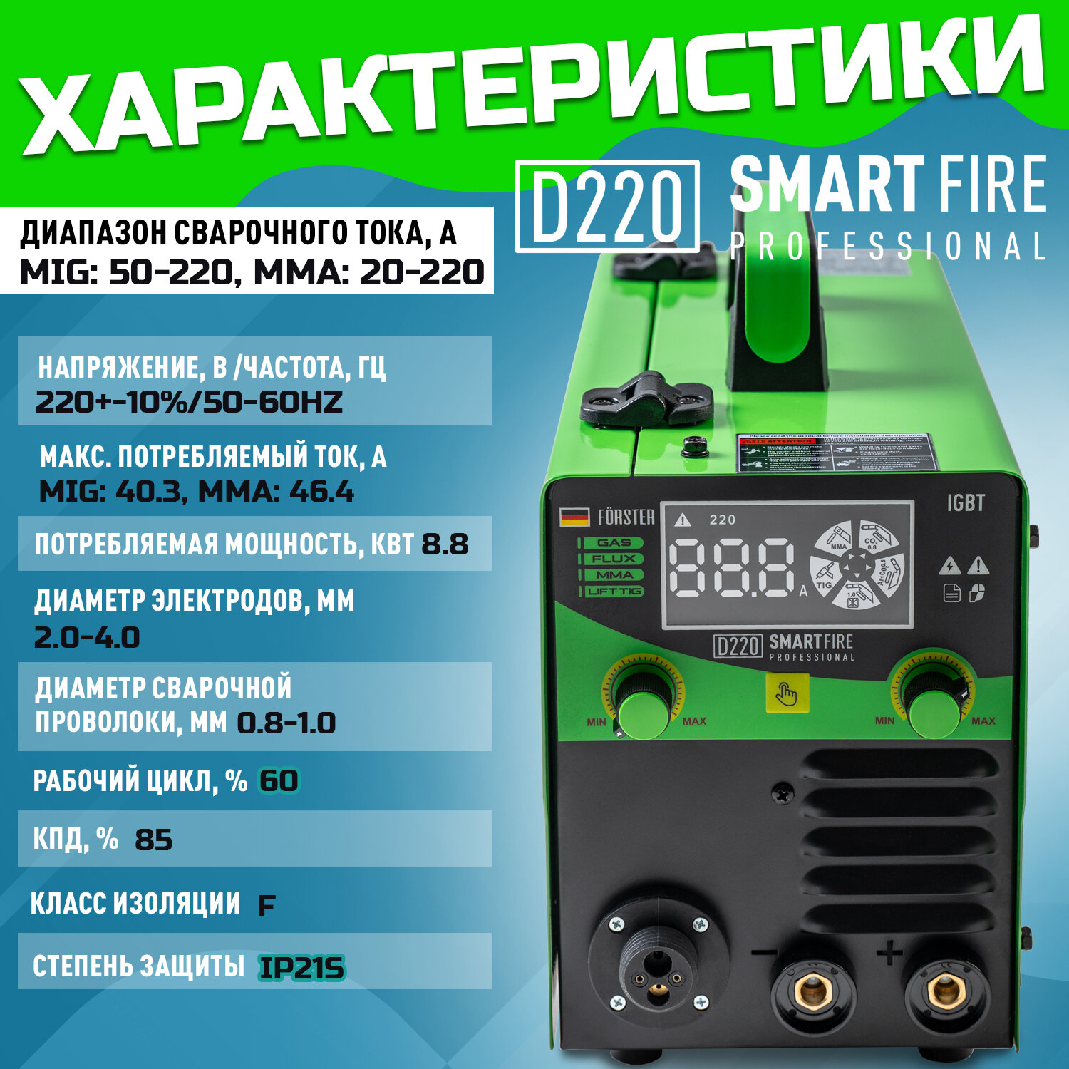Сварочный инверторный полуавтомат FORSTER SmartFire D220/Полуавтоматический инвертор для сварки проволокой и электродом/ С газом и без газа информация:
