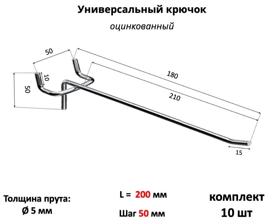 Крючки 20 см для эконом-панелей и перфорации (универсальные - шаг 50) металлические, 10 шт, (5мм) информация: