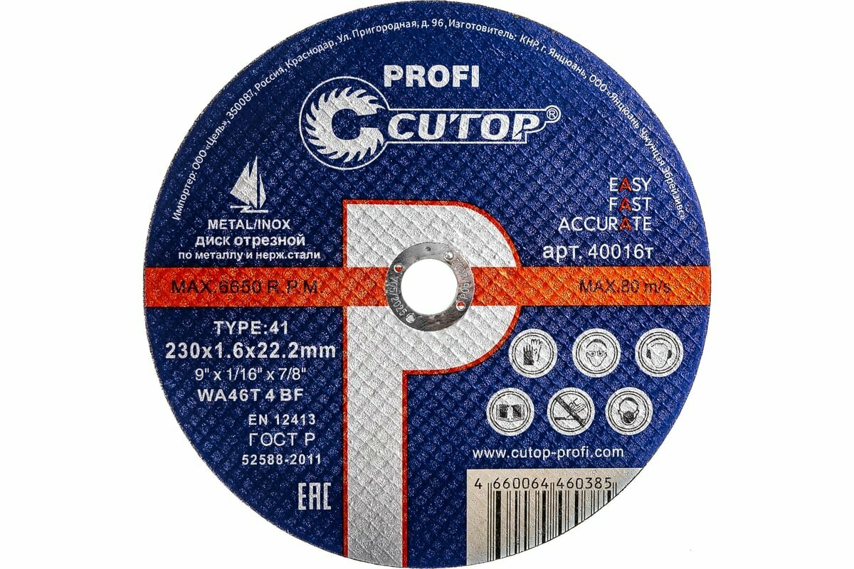 CUTOP Профессиональный диск отрезной по металлу и нержавеющей стали Т41-230 х 1,6 х 22,2 мм 40016т информация: