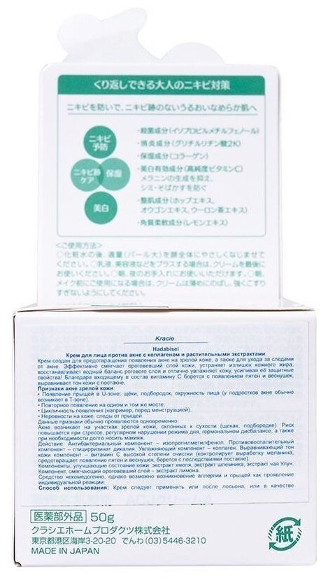 KRACIE Крем для лица Hadabisei против акне и купероза с коллагеном и растительными экстрактами, 50 гр информация: