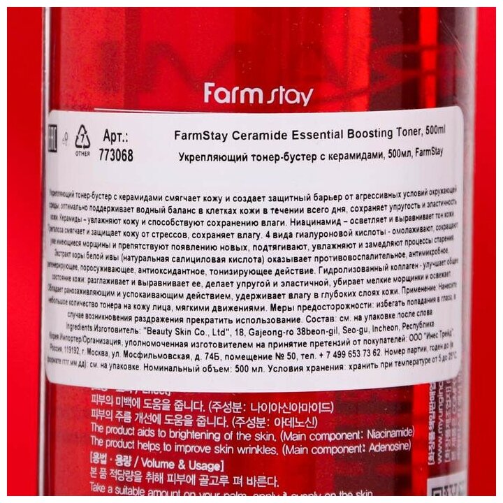 FarmStay Укрепляющий тонер-бустер для лица с керамидами Ceramide Essential Boosting Toner 500мл информация: