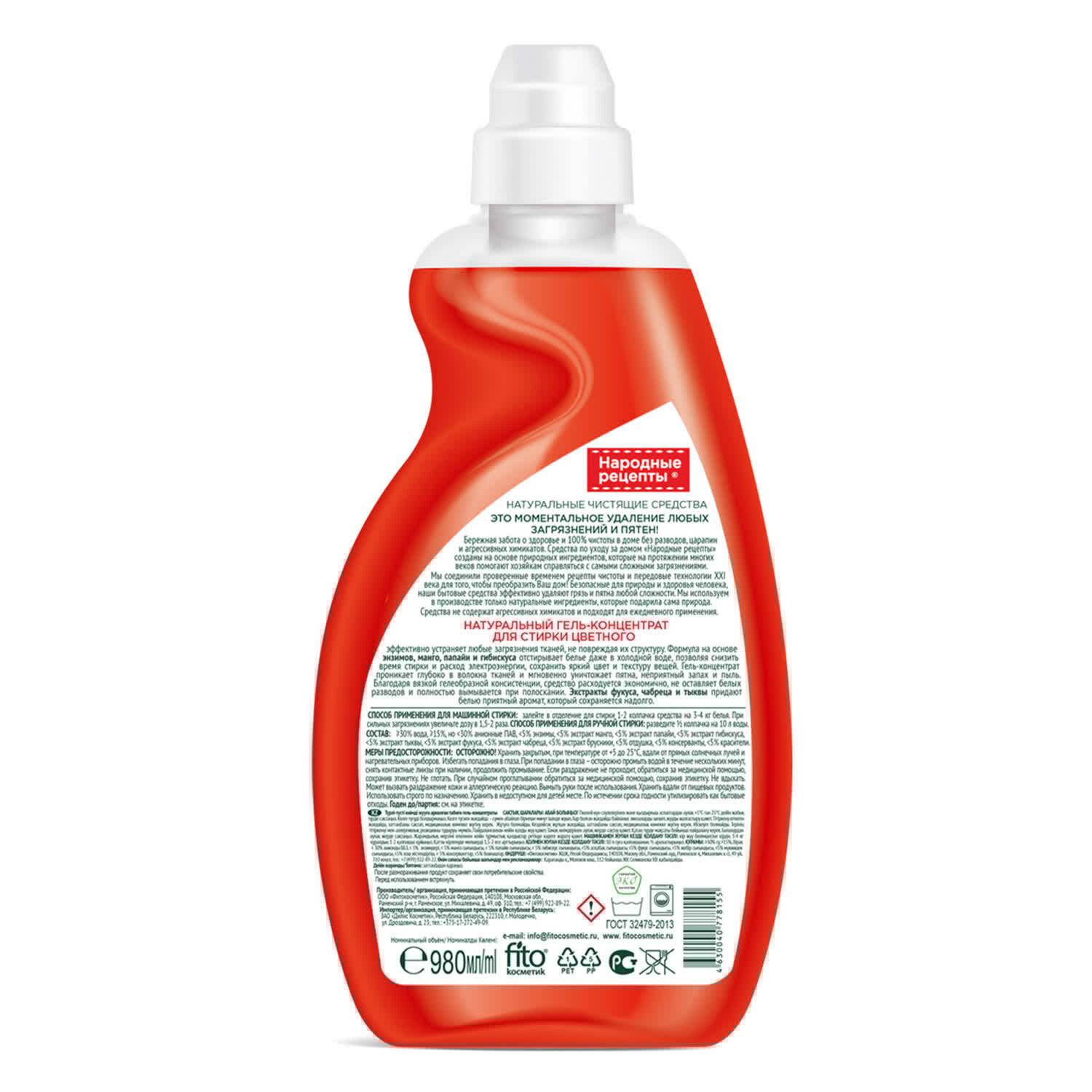 Гель-концентрат для стирки Фитокосметик "Народные рецепты", натуральный, для цветного белья, 980 мл информация: