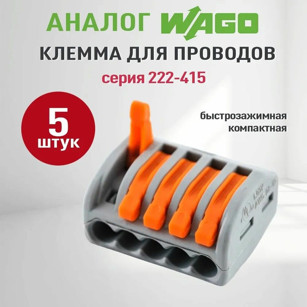 Ваго 222415 клемма 5х2,5мм быстрозажимная (5шт) / WAGO 222-415 клеммник 5х(0,08-2,5мм2) быстрозажимной с рычажком (упак. 5шт.)