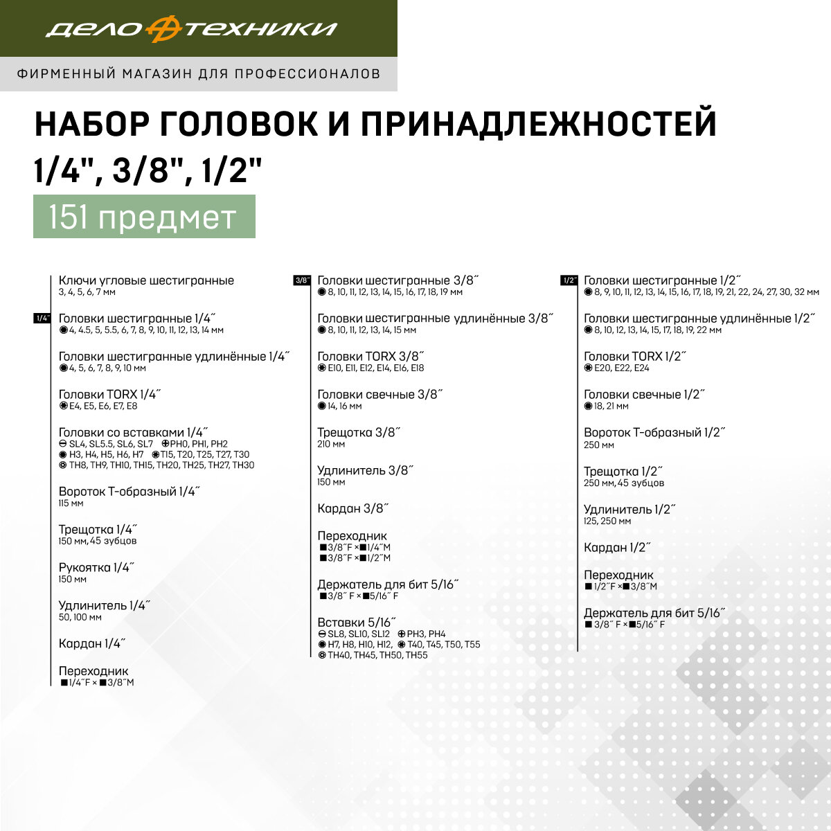Набор головок и принадлежностей 1/4", 3/8", 1/2" 151предм., Дело Техники, 620851 информация: