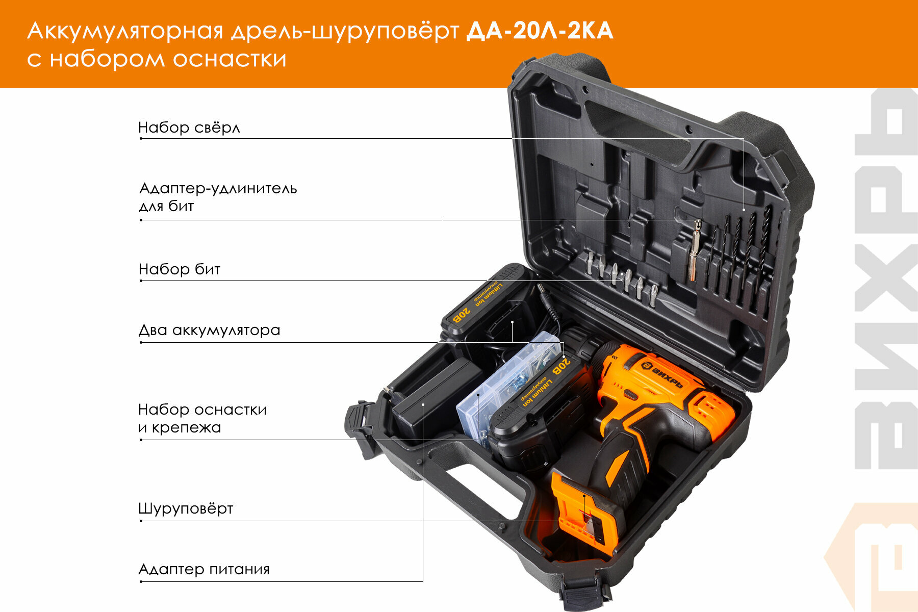 Дрель аккумуляторная Вихрь ДА-20Л-2КА 20В Li 1_5Ач 42Нм 10мм 2 аккумулятора_ кейс_ набор оснастки 65 предметов информация: