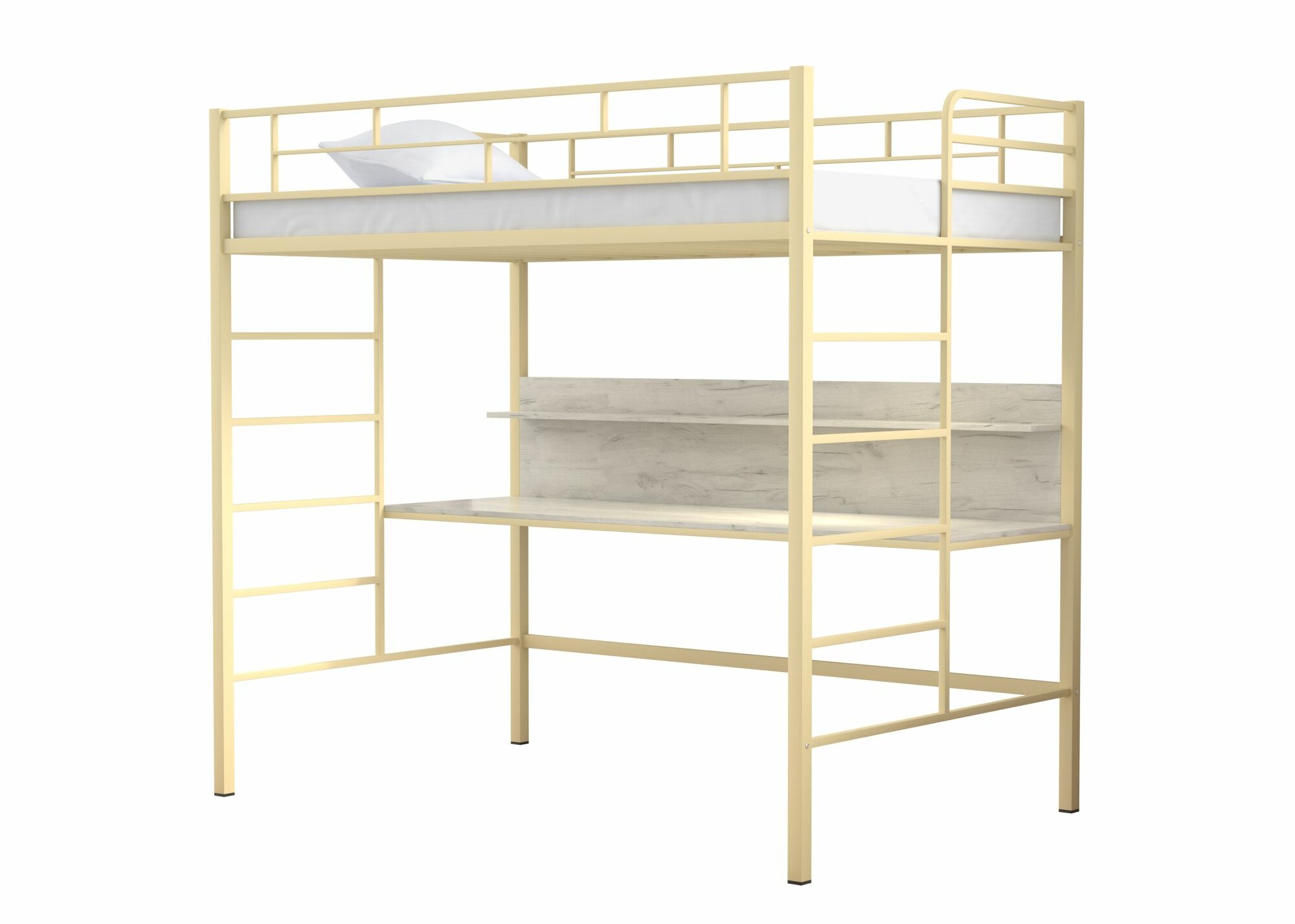 Кровать-чердак "Амстердам" Слоновая кость со столом Дуб молочный/ детская/ 90х190 см/ двухъярусная кровать с рабочей зоной/ для детей и взрослых/ железная/ металлическая/ двухэтажная/ взрослая