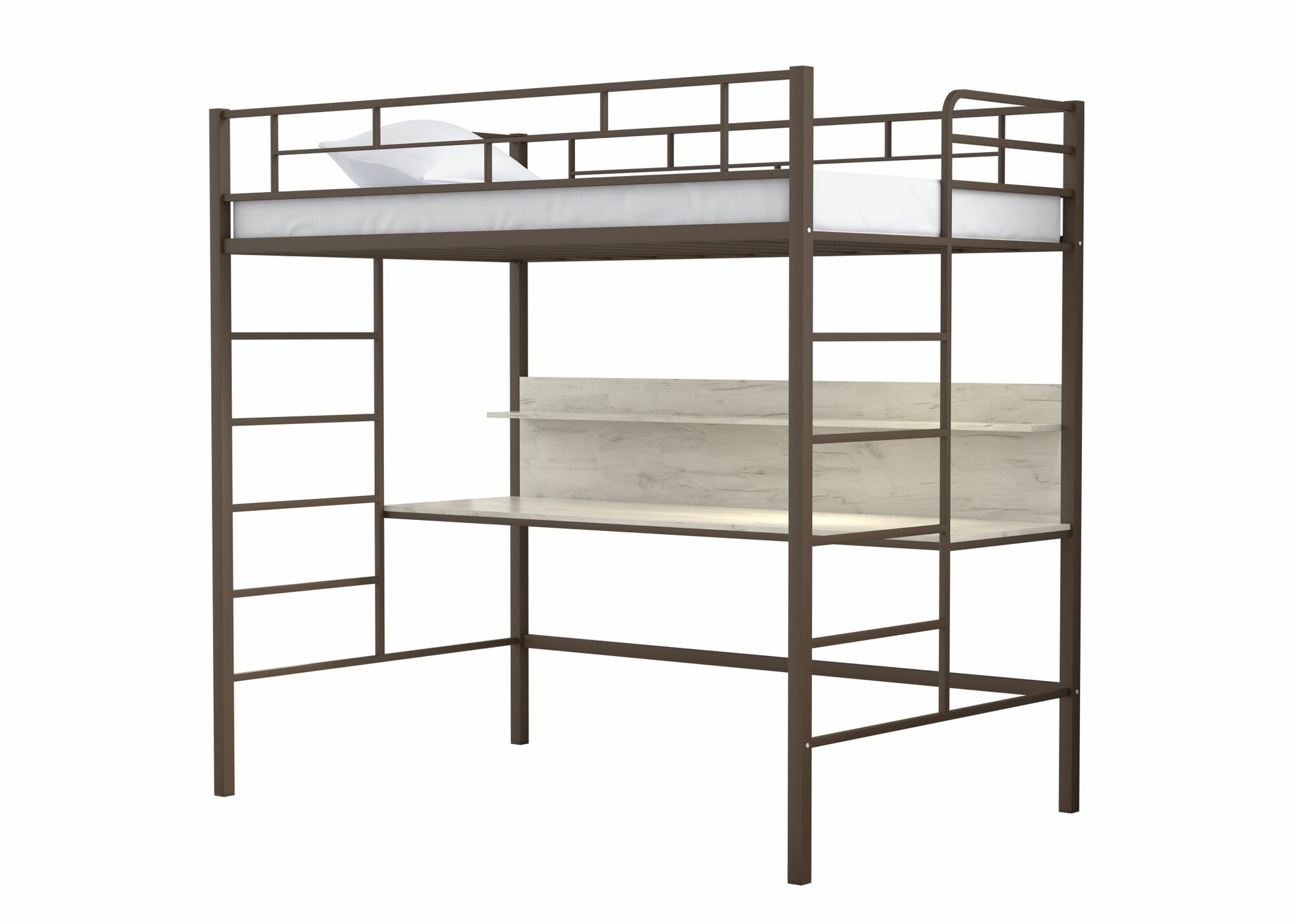 Кровать чердак "Амстердам" Коричневая со столом Дуб молочный/ детская/ 90х190 см/ двухъярусная кровать с рабочей зоной/ для детей и взрослых/ железная/ металлическая/ двухэтажная/ взрослая/ высокая