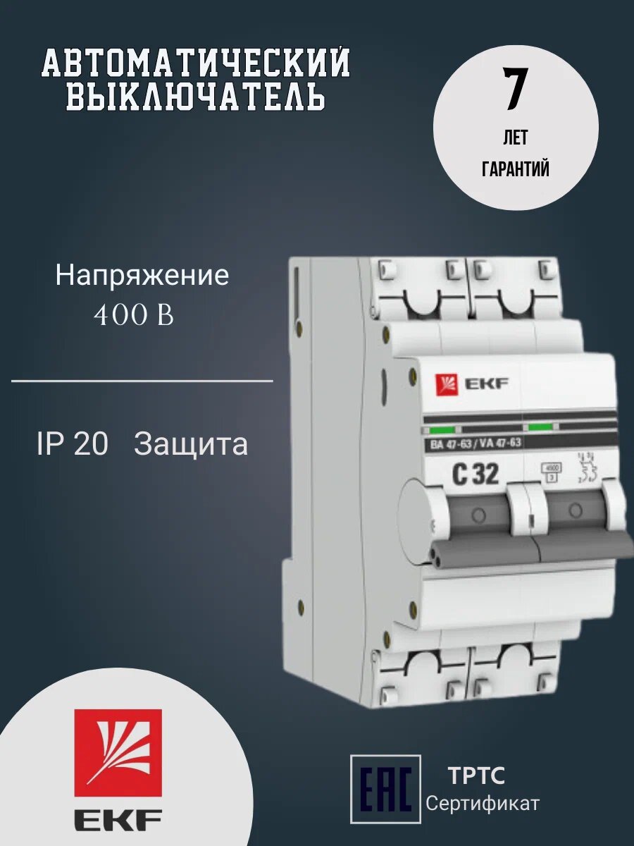 Автоматический выключатель (С) 2P 32А 4,5kA (ВА 47-63), EKF PROxima информация: