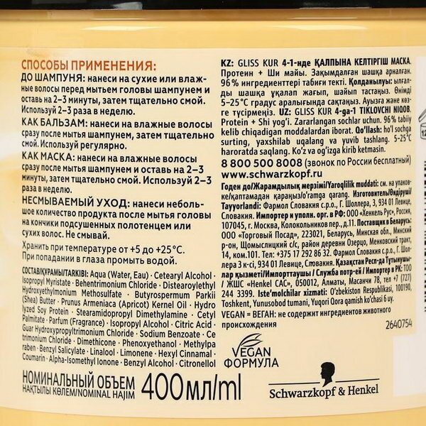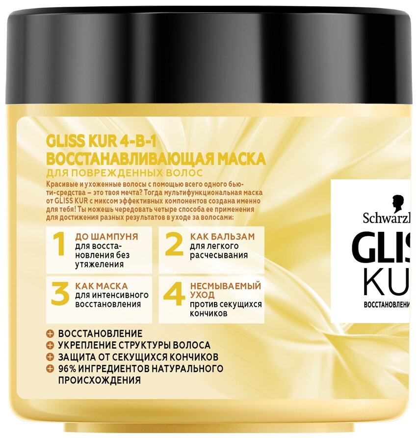 Gliss Kur Восстанавливающая маска 4-в-1 для поврежденных волос, укрепляющих микс, 400 мл информация: