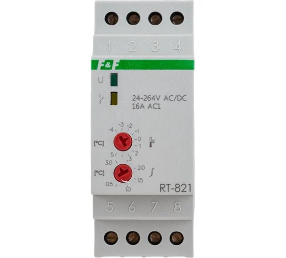 Регулятор температуры F&f RT-821 напряжение питания 50-264 В АС/DC, диапазон от -4 до +5 гр., контакт 1NO/NC, максимальный ток 16 А., EA07.001.003