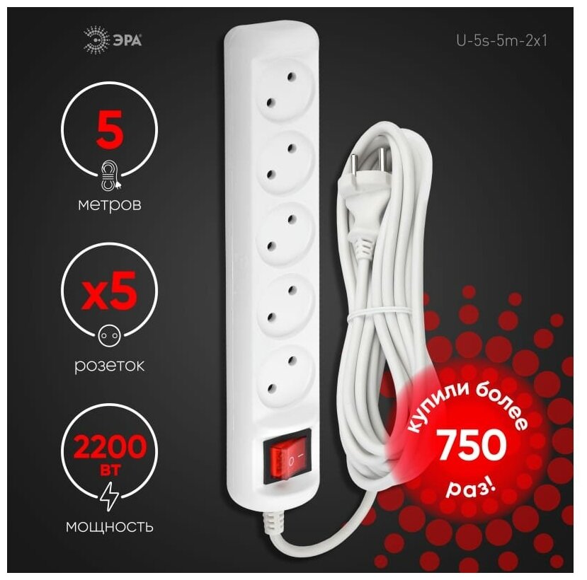 Удлинитель сетевой электрический без заземления с выключателем U-5s-5m-2x1 ЭРА / Сетевой фильтр 5 розеток, 5м, 10А, 2x1мм2