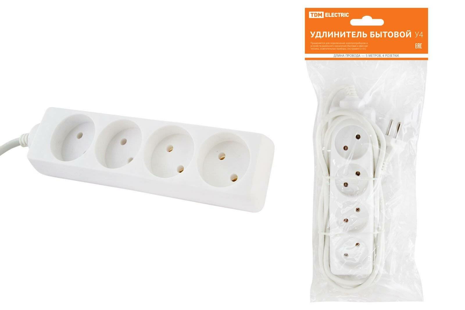 10 цен на Удлинитель бытовой 4 гнезда, 3 м, ПВС, 2х0.75 мм², без заземления, 10 А, 250 В, TDM Electric, У4, SQ1303-0211