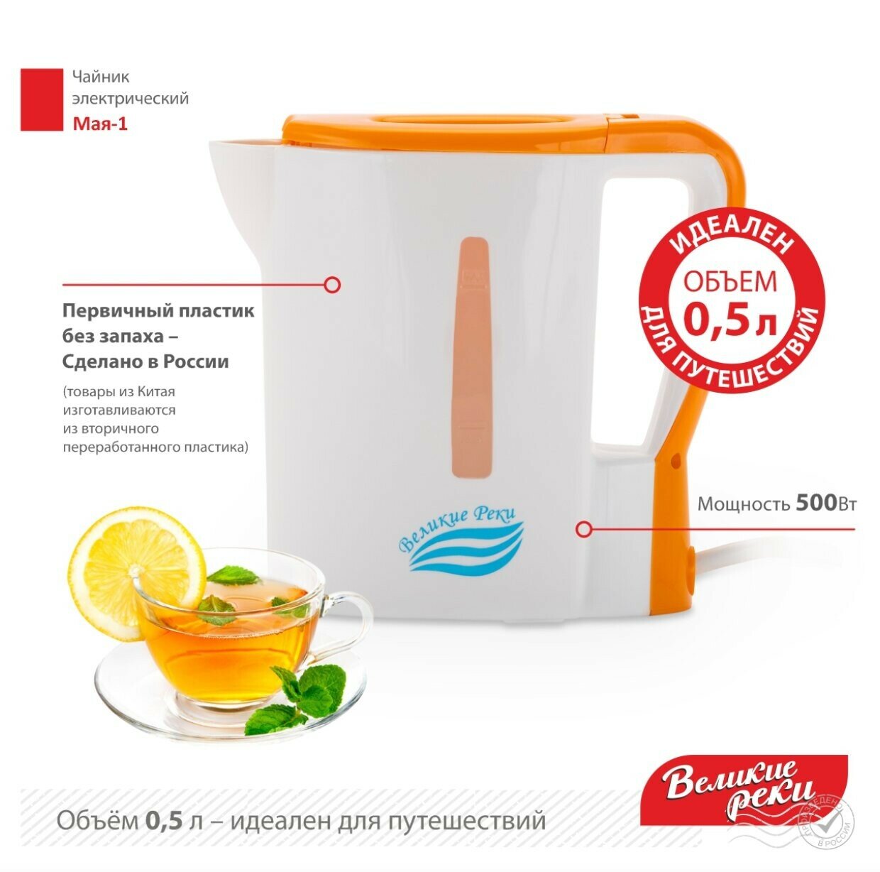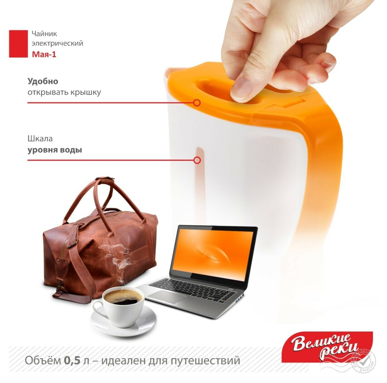 Чайник Великие Реки Мая-1 бело-оранжевый, 0,5 л, пластик, 500 Вт .